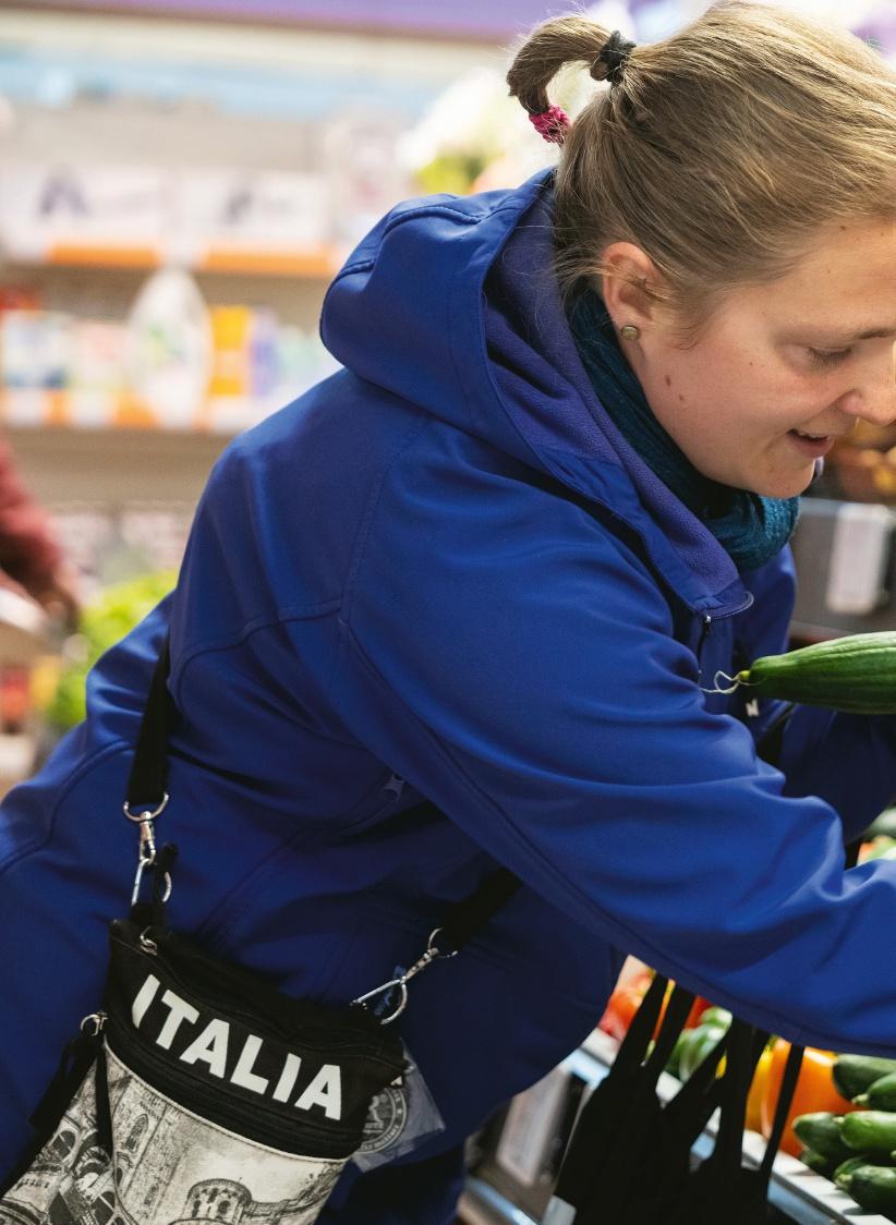 Noomi Jägerhorn on Keskon vastuullisuusjohtaja, joka käy lähikaupassa joka päivä ja opettelee kantamaan mukanaan omaa kassia ostoksia varten.