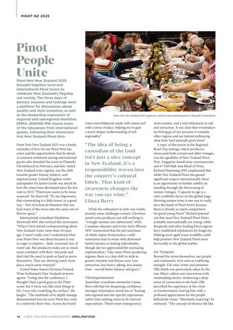 The brand of New Zealand wine was undoubtedly boosted by the wonderful Pinot Noir New Zealand 2025, held in Ōtautahi Christchurch in February, with an array of influential international visitors soaking up the extraordinary manaakitanga of the event, including Monique Fiso’s modern style hangi, steaming succulently in the grounds of the Christchurch Town Hall. Themes from te ao Māori – Tūrangawaewae, Kaikiakitanga, and Ā Mua – were used to guide an extraordinary event, anchored in Aotearoa, drawing glowing responses from international media who also travelled our wine regions (page 14). “I’ve returned to the UK feeling like a portal has been opened to your world-class Pinot Noir on a level that I could barely have dreamt of,” says British wine writer and presenter Olly Smith. “And that open portal has travelled home with me.” That’s a response worth raising a glass to!