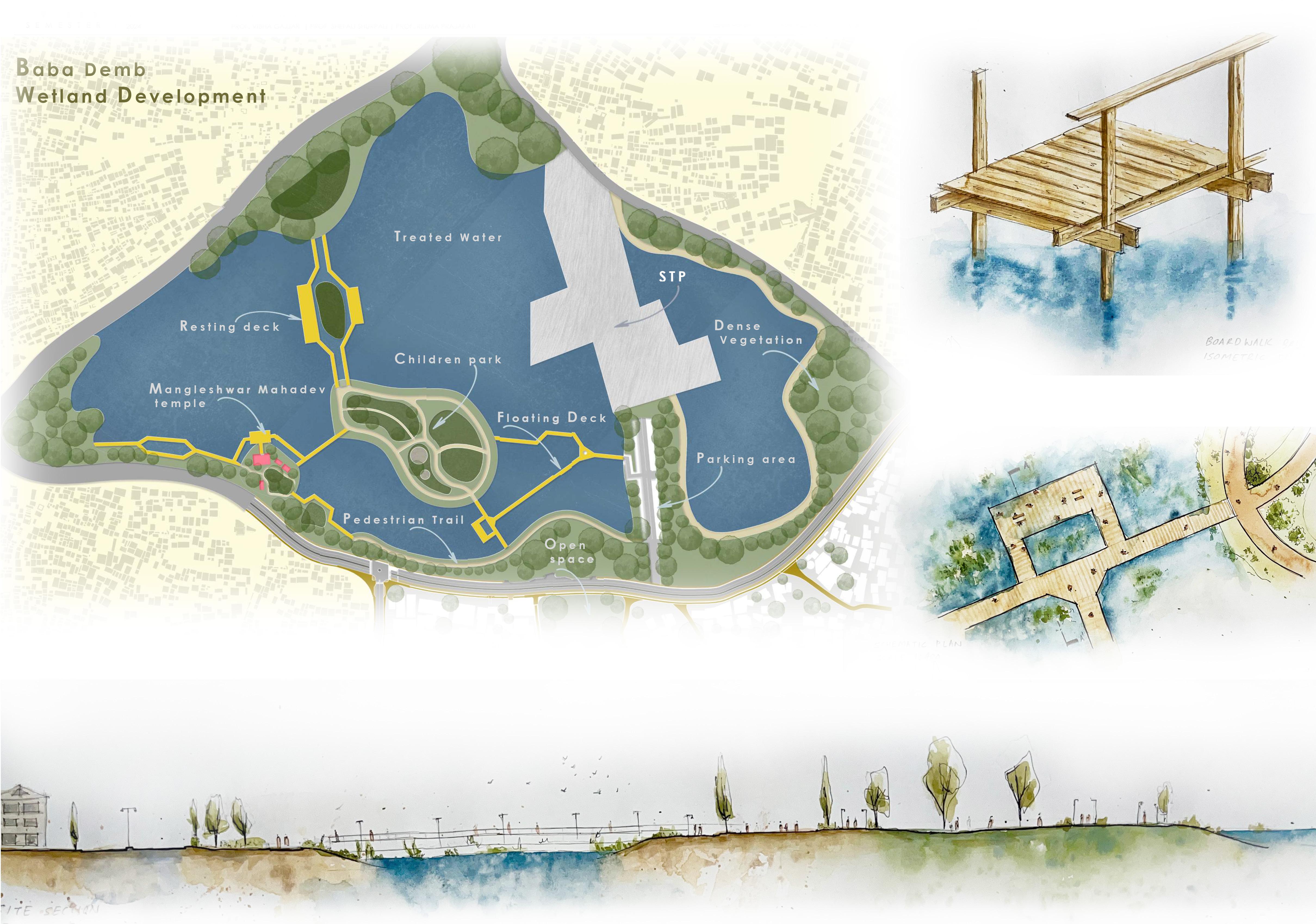 ` Baba Demb was a freshwater catchment , but infrastructural challenges have disturbed its natural hydrology, turning it into a wetland with stagnant water. Lack of maintenance has led to garbage accumulation and encroachment . Our proposal aims to revitalize the wetland and balance the ecosystem through thoughtful human intervention and the restoration of flora and fauna . We initially planned to create public parks and recreational spaces, but realized this would encroach on and disturb the wetland. Instead, thus we identified islands within the wetland and plan to connect these floating islands, improving the water edge without harming the ecosystem.