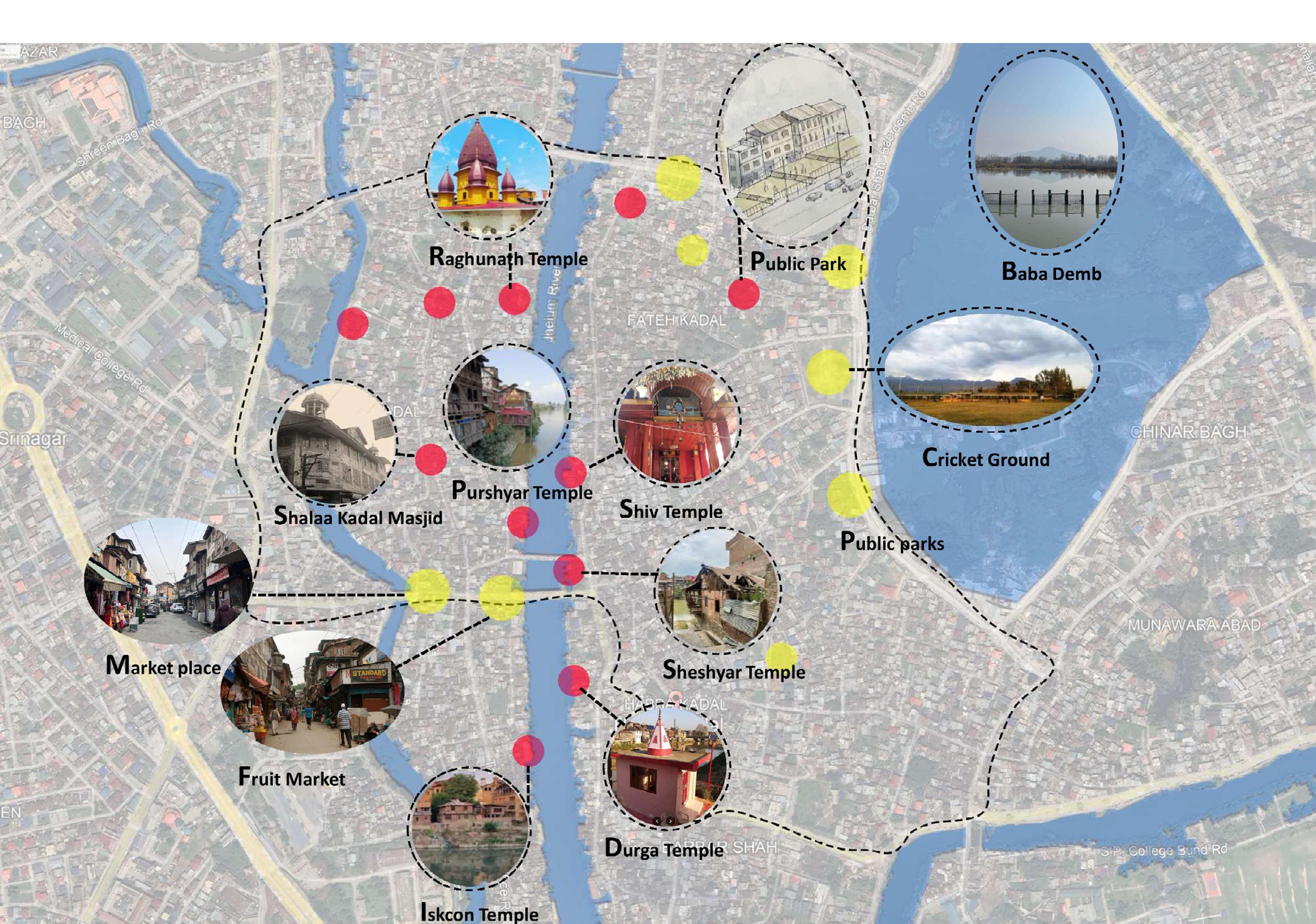 Along the Jhelum River edge , we have identified open spaces that can be used for s mallscale community gatherings . We plan to revitalize old vacant houses , maintaining them and repurposing them to meet the city’s needs. Three old heritage structures have been selected for transformation into a conflictorium, museum, and art galleries to promote local culture and history. Additionally, we are promoting pedestrian-friendly streets to enhance accessibility and walkability in the area.