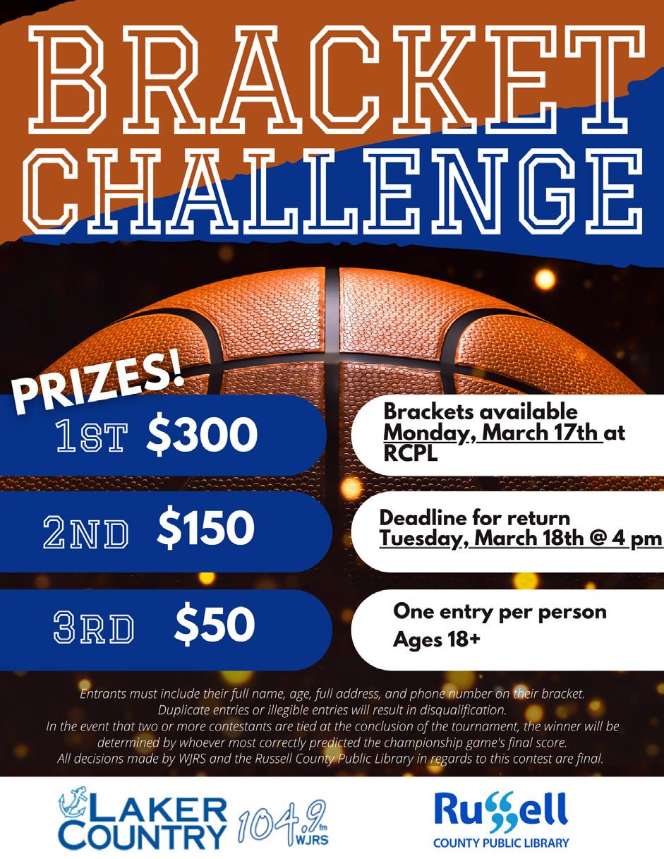 One entry per person. Entrants must include their full name, age, full address, and phone number on their bracket. Duplicate entries or illegible entries will result in disqualification. In the event that two or more contestants are tied at the conclusion of the tournament, the winner will be determined by whoever most correctly predicted the championship game’s final score. All decisions made by WJRS and the Russell County Public Library in regards to this contest are final.