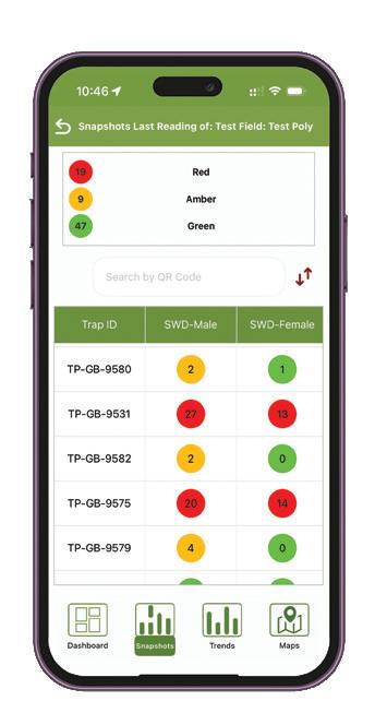 Powered by advanced artificial intelligence techniques, TruePest identifies, counts and distinguishes between male and female SWD compared to other Drosophila, and identifies and counts thrips species, on sticky boards using your smartphone device. Receive SWD and thrips counts in realtime, in under 30 seconds. Using a preset threshold, TruePest provides a colour-coded trap map displaying where your crop is most at risk. TruePest compares current readings with previous ones and illustrates how the population is increasing/ decreasing over time.