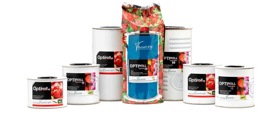 Our full Optiroll range is also available in white. The Optiroll Super White Plus rolls are encapsulated with the midge pheromone of your choosing. These pheromones include the blueberry gall midge, (Dasineura oxycoccana), blackberry midge, (Dasineura plicatrix) and the raspberry cane midge, (Resseliella theobaldi). The addition of a blue pattern on the white roller traps increases the rolls attraction to thrips.