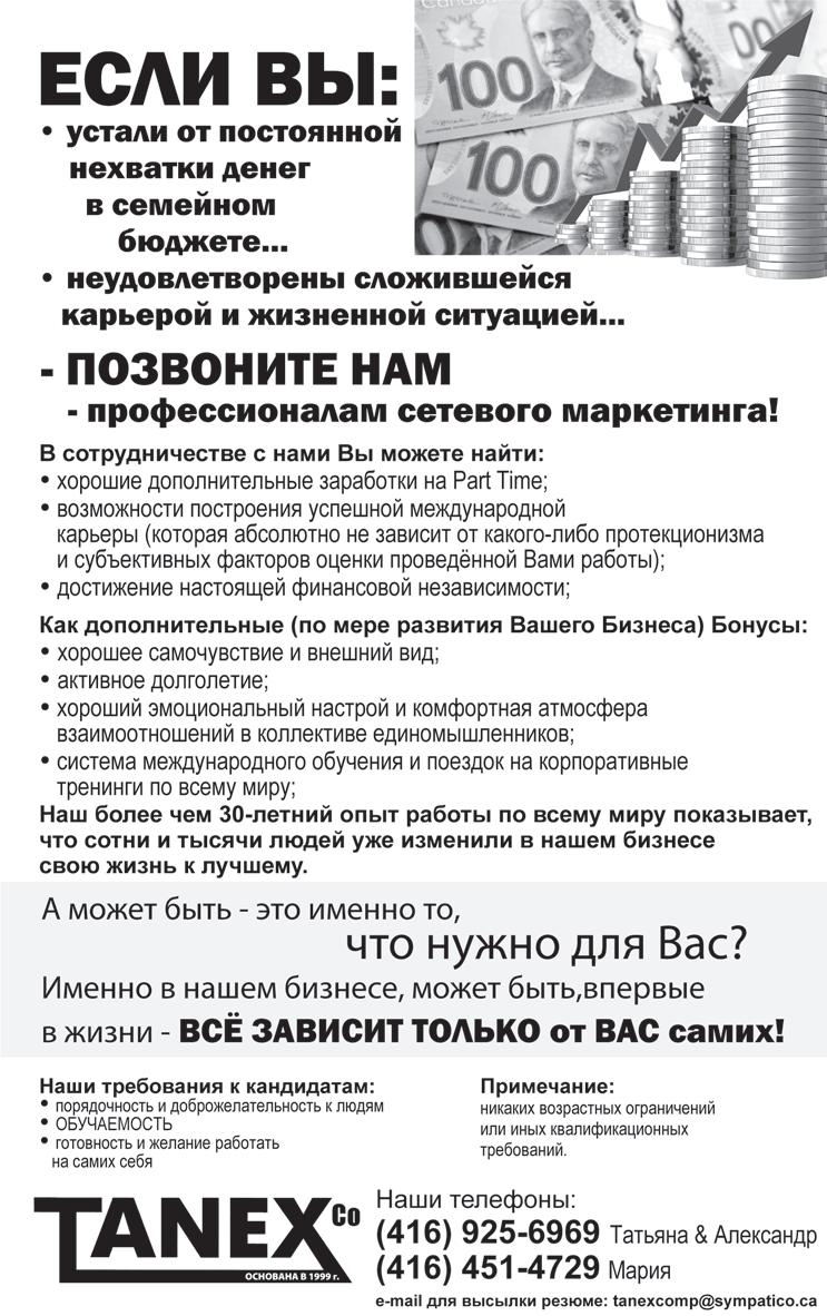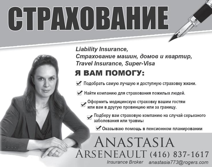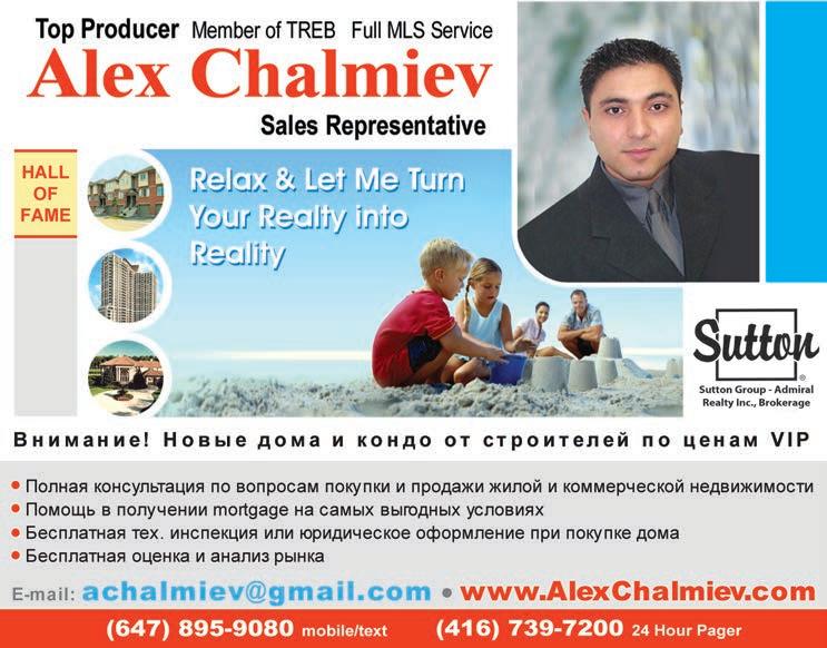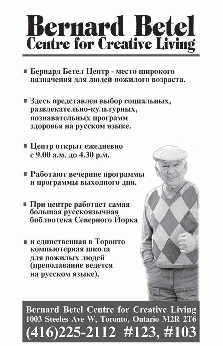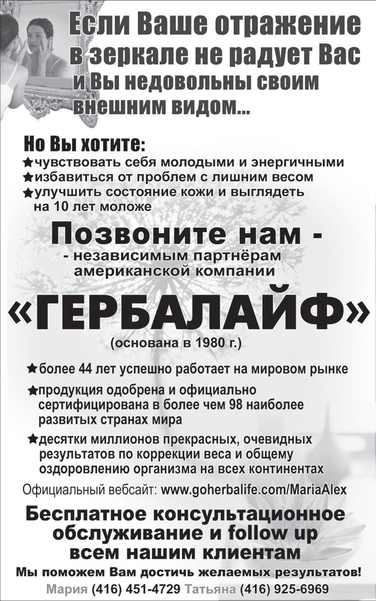 11 www.masterpages.ca (416) 663-3999 Потому что жизнь продолжается, и каждый из нас может сделать ее лучше для себя, своей семьи, общины. Мы от души благодарим наших рекламодателей, наших читателей, с уверенностью и надеждой на то, что лучшие времена обязательно придут. Я хочу пожелать