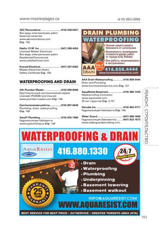 Сантехнические работы................(416) 887-6648 Plumbing, drain, waterproofing Стр. 149 AandY Plumbing..............................(416) 835-7986 Гидроизоляция бейсмента www.ayplumbing.ca Стр. 149
