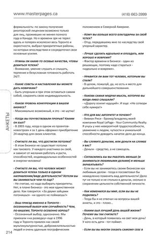 (416) 663-3999 положением в Северной Америке. - Кoмy вы бoльшe вceгo блaгoдapны зa cвoй ycпeх? - Отцу, передавшему мне по наследству свой упорный характер. - Лучше сделать идеально и опоздать, или хорошо и вовремя? - Фактор времени в бизнесе - один из решающих, поэтому надо стараться «идеально и вовремя». - Нравится ли вам тот человек, которым вы стали? - В целом, пожалуй, да, но есть и место для дальнейшего совершенствования. - Какова самая мудрая мысль, которую вы когда-либо слышали? - «Дорогу осилит идущий». И еще: «Не сотвори себе кумира!» - Кто для вас авторитет и почему? - Вивиан Риси - брокер/владелец моей компании Royal LePage - Your Community Realty. Я учусь у нее невероятной трудоспособности, уважению к людям, чуткости и уникальной способности доводить начатое дело до конца. - Вы служите деньгам, или деньги на службе у вас? - Деньги - средство, а не самоцель. - Согласились бы вы работать меньше (и заниматься любимыми делами) и меньше зарабатывать? - Если вы не занимаетесь своим бизнесом как любимым делом - тогда я посоветовал бы немедленно поменять вид деятельности! Дело тут не только и не столько в деньгах, сколько в сохранении цельности собственной личности. - Как изменился бы мир, если бы вы не родились? - Тогда бы я не отвечал на вопросы вашей анкеты, и это - плохо... - Каким был лучший день вашей жизни? Почему вы так считаете? - День, в который появилась на свет моя дочь! У кого есть дети - тот поймет. - Если бы вы могли сказать самому себе в