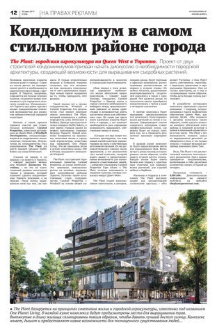 интересованности в экологии и социальной ответственности. «Наш подход к этим аспектам определяет особенности жизни обитателей наших комплексов, - говорит Адам Ошхорн, совладелец Curated Properties. – Прежде жизнь в городе означала необходимость выбирать между привлекательным районом со всеми удобствами и возможностью иметь достаточно земли для собственного сада. Но скоро две трети всего населения планеты будут жить в городах, а это означает необходимость дать горожанам возможность выращивать собственные овощи и зелень. «Сегодня это еще может показаться чрезмерным, что наш новый жилой комплекс сориентирован на связь с собственным источником питания. Но мы руководствовались именно таким принципом, а его результатом стал жилой комплекс, который живет, дышит и предоставляет новые возможности для полноценного существования людей, - добавляет совладелец Curated Properties Гэри Айзен. – The Plant отлично вписывается в пищевую культуру, которая сложилась вокруг Queen West». The Plant станет многоцелевым комплексом, в котором,