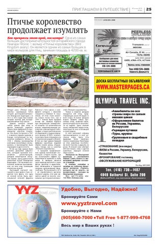 стей «Птичьего королевства». Только в главном авиарии находится 400 птиц, представляющих около 80 видов со всего мира. В малом авиарии можно увидеть самых крохотных птиц, включая таких, шесть которых могут уместиться на ладони. Здесь обитает около пятидесяти видов птиц, некоторые из них исчезающие и очень редкие. В зоне рептилий собраны пресмыкающиеся со всех регионов мира. Здесь есть ящерицы, змеи, черепахи, пауки и скорпионы. Некоторых из этих животных посетители могут трогать и держать на руках. В ночной зоне обитают летучие мыши, совы и другие животные, ведущие ночной образ жизни. Экскурсия на Ниагарские водопады с посещением Парада Санта Клауса и шоколадной фабрики состоится 14 ноября. В течение сентября и октября по субботам проводятся экскурсии «Торонто, которого вы не знаете», по воскресеньям – поездки на Ниагарские водопады. Тел.: 647-771-4232, 416722-9043. Ivritours.com