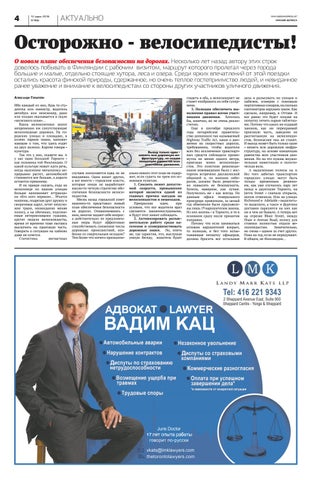 Осторожно - велосипедисты! О новом плане обеспечения безопасности на дорогах. Несколько лет назад автору этих строк довелось побывать в Финляндии с рабочим визитом, маршрут которого пролегал через города большие и малые, отдельно стоящие хутора, леса и озера. Среди ярких впечатлений от этой поездки остались красота финской природы, сдержанное, но очень теплое гостеприимство людей, и невиданное ранее уважение и внимание к велосипедистам со стороны других участников уличного движения. Александр Герштейн Ибо каждый из них, будь то студентка или министр, водитель автобуса или пенсионер, рано или поздно оказывается в седле «железного коня»... Вдоль великолепных шоссе непременно им сопутствующие велосипедные дорожки. На городских улицах и площадях, в аллеях парков знаки, напоминающие о том, что здесь ездят на двух колесах. Короче говоря культура. Так это у них, скажете вы. А у нас один Большой Торонто как половина той Финляндии. О какой культуре может идти речь, когда население мегаполиса непрерывно растет, автомобилей становится все больше, а дороги остаются прежними. И по правде сказать, езда на велосипеде по нашим улицам больше напоминает аттракцион «Кто кого первым»… Мчатся машины, подрезая друг дружку и сворачивая вдруг, летят неуклюжие траки, неожиданно меняя полосу, а на обочинах, подгоняемые нетерпеливыми гудками, крутят педали велосипедисты, время от времени тоже пытаясь выскочить на проезжую часть. Говорить о ситуации на хайвэях даже не хочется. Статистика несчастных