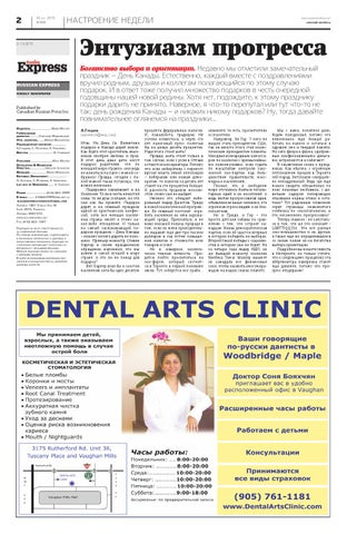 Издатель ���������������������������� Майя Мастер Генеральный директор.............Григорий Жидовецкий Отв. секретарь ���������Мария Михайлова Редакционная коллегия:................... А.Гладков, С. Петренко, А. Герштейн. Верстка �������������������������������� В. Самодай Publisher �����������������������������Maia Master Developing & Marketing Director.....................Gregory Jidovetski Manager ��������������������� Maria Mikhailova Editorial Department: ....................... A. Gladkov, S. Petrenko, A. Gershtein. Lay-out of Newspaper.... ���� V. Samoday Phone �������������������������� (416) 663–3999 E-mails ��������� 4166633999@bellnet.ca russianexpresstoronto@gmail.com Address: 1881 Steeles Ave. W. Suite 207A, Toronto, Ontario, M3H 5Y4 www.russianexpress.net Fax: (416) 663–1947 Редакция не несет ответственности за содержание рекламы. По поводу информации, содержащейся в рекламных материалах о здоровье и лекарственных препаратах, редакция настоятельно рекомендует читателям советоваться с лечащими врачами. Мнение редакции может не совпадать с мнением авторов. В газете использованы материалы российской и канадской прессы, информационных агентств.