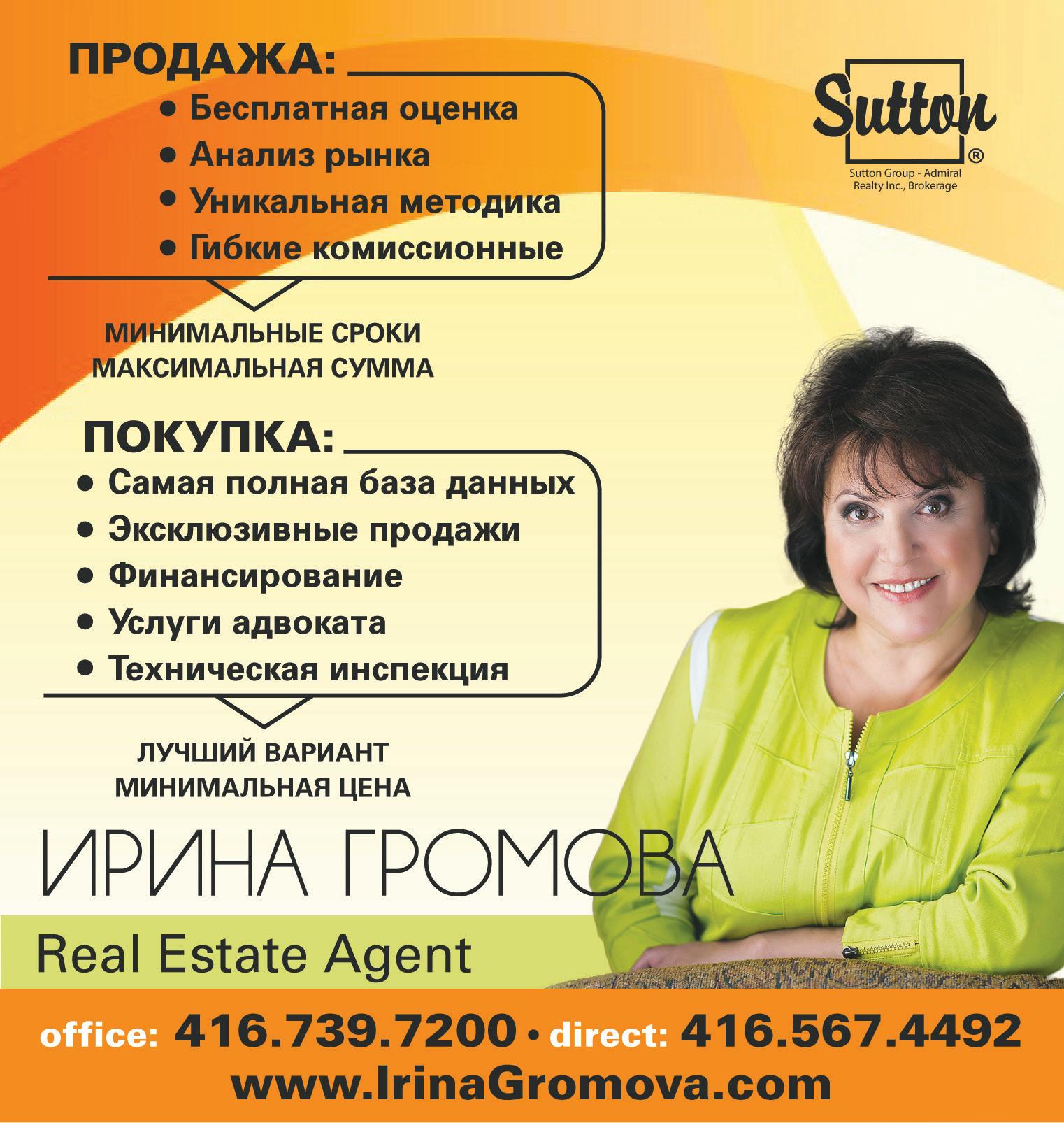 5OCTOBER 14, 2022 №1288 www RussianExpREss nET «торонто экспресс»  416-663–3999отдел рекламы «торонто экспресс» НОВОСТИ ОНТАРИО ПРОДАЁТСЯ бизнес $199,000 Престижный Yorkville. Товары для детей лучших мировых дизайнеров. Солидная клиентская база. Купив, вы получаете хорошо оборудованный магазин и связи с компаниями. Станьте боссом. ДОМ В BARRIE $998,900 Большой и светлый. 4 спальни, 2,5 ванных. Внизу большая кухня, гостевая и family room с камином. Функциональная планировка. КУПИМ 1 и 2 комн. квартиры, а также дома Звоните сегодня! Покупатели ждут! Теl: (905) 417-0738 solutionsservices@rogers.com Бесплатные услуги финансиста и технического инспектора/адвоката по вашему выбору. Постоянно обновляемая база данных инвестиций. Новое строительство квартир - VIP selection. Профессиональная помощь и консультация в вопросах поупки/продажи/аренды домов и квартир, а также инвестиций и бизнесов. Плазы, доходные дома (plazas/multiplexes). Broker, SUTTON GROUP ADMIRAl Diamond Award SOLD: Amazing 4 bed/3 bath/2 Car Garage Home in Woodland Hills, Newmarket - $1,280,000.Premium Lot (48*222!), Backing On Ravine, Siding On Green Space. Flexible Closing. Bathurst / Yonge / David Drive COMING SOON: Functional 2 bed/1 Bath/Prkg Condo On Lake Shore, Needs TLC, Under Probate. Lake Shore / Brown’s Line NEW - $699,000: Fully Renovated 3 Bed/2 Bath Condo/Prkg/Locker Condo In Thornhill. Yonge / Dudley NEW - $758,000: Wonderful 2 Bed/2 Bath Condo/Prkg/Locker Condo In Hot Midtown. Eglinton / Mount Pleasant FOR SALE: 2 Beautiful Acres of Permit Application Ready Vacant Land in Prestigious King City - $2,800,000.00 Dufferin & King Кто кого? Голосуем из