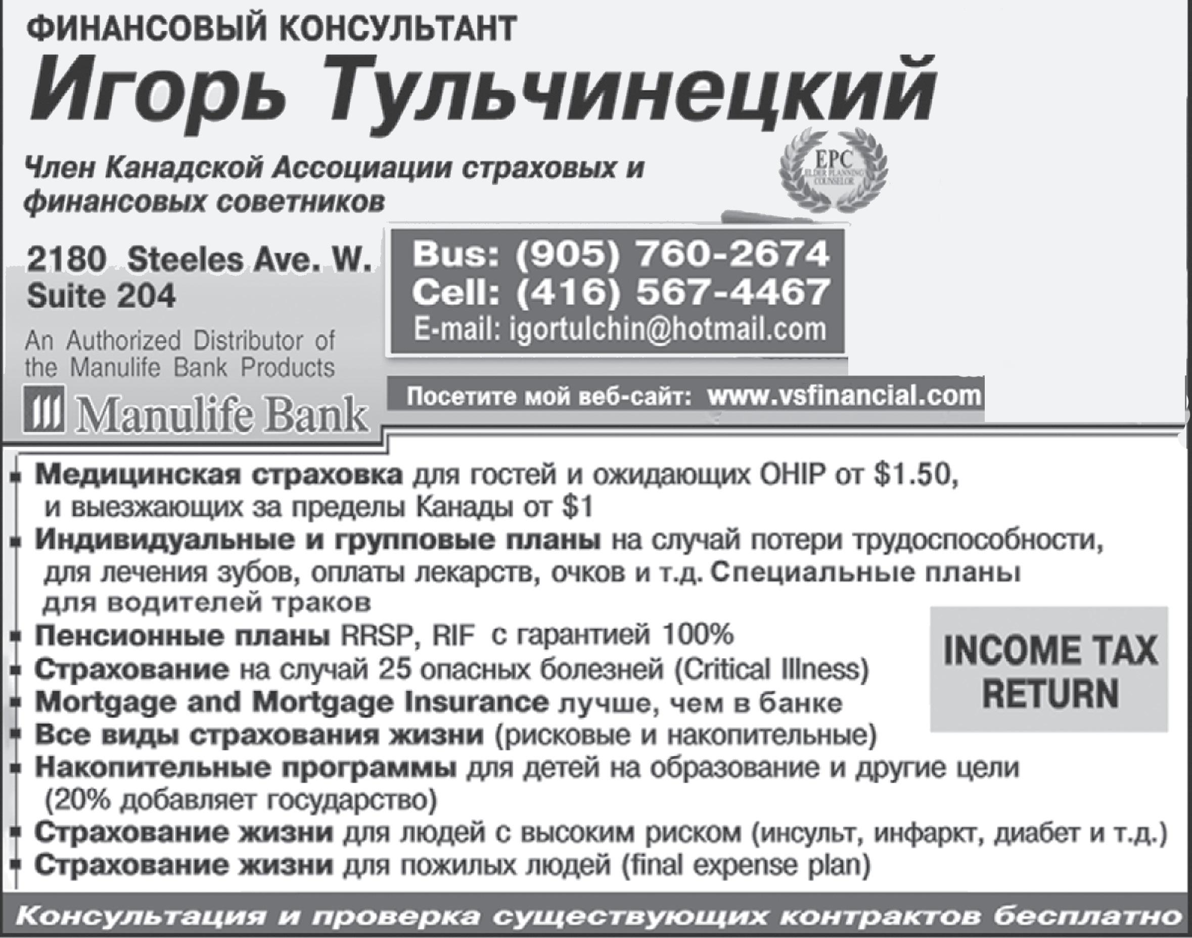 20 416-663–3999OCTOBER 21, 2022 №1289 www RussianExpREss nET «торонто экспресс» отдел рекламы «торонто экспресс» МЫ ЗАЩИТИМ ВАШИ ИНТЕРЕСЫ ACCIDENT? ЗВОНИТЕ НАМ! SLOMYANSKI LAW Personal Injury Law Firm МАКСИМАЛЬНАЯ КОМПЕНСАЦИЯ В КАЖДОМ КОНКРЕТНОМ СЛУЧАЕ ФИЗИЧЕСКИЕ И ПСИХОЛОГИЧЕСКИЕ ТРАВМЫ ЛЮБОЙ СТЕПЕНИ ТЯЖЕСТИ ПРИ АВАРИЯХ, ПАДЕНИЯХ И ДРУГИХ НЕСЧАСТНЫХ СЛУЧАЯХ ИСКИ К СТРАХОВЫМ КОМПАНИЯМ ВЫСОКИЙ ПРОФЕССИОНАЛИЗМ ВНИМАТЕЛЬНОЕ ОТНОШЕНИЕ ВЫЕЗЖАЕМ НА ДОМ И В ГОСПИТАЛЬ ПЕРВАЯ КОНСУЛЬТАЦИЯ БЕСПЛАТНО ОПЛАТА ТОЛЬКО ПО ФАКТУ УСПЕШНОГО ЗАВЕРШЕНИЯ ДЕЛА (416) 519.1006 (416) 897.0474 www.slomyanskilaw.com / info@slomyanskilaw.com 1110 Finch Ave West, Suite 500, Toronto, ON M3J 2T2 MARIANA SLOMYANSKI LL.B, LL.M, Barrister & Solicitor, Notary Public SAVE MAX $$$ website: SVETLANAREAL.COM cell: (647) 988-2056 office: (647) 313-3400 ПРОДАЖА БЕЗ ЛИСТИНГ КОМИCСИОННЫХ ПРИ ПОСЛЕДУЮЩЕЙ ПОКУПКЕ СО МНОЙ ОПЫТ РАБОТЫ ПО ВСЕМУ ОНТАРИО ДОМА, КВАРТИРЫ, УЧАСТКИ ЗЕМЛИ, ИНВЕСТМЕНТ ПРОДАЖА, ПОКУПКА, РЕНТ СВЕТЛАНА НЕСТЕРЕНКО Sales Representative PRODUCERS CLUB AWARD 2021 IRF Преобразования на заднем дворе: ● Interlock Patios, инсталляции из натурального камня ● Подпорная стена, садовые стены ● Патио и работы с камнем ● Наружный шпон (Veneer) дома ● Landscape & Hardscape ● Системы наружного освещения 647-784-4477 Instagram: @soncebuildexcellence info@SonceHomes.ca SonceHomes.ca S.O.N.C.E. HOMES CONSTRUCTION МЫ СПЕЦИАЛИЗИРУЕМСЯ НА ВСЕХ ВИДАХ НАРУЖНЫХ ПРОЕКТОВ: ● Строительство домов, гаражей, пристроек, дек, террас, балконов ● ПРЕОБРАЗОВАНИЕ / РЕМОНТ: ● Ванных комнат ● Кухонь ● Замена полов ● Реконструкция лестниц ● Замена и инсталляция перил ● Все виды внутренних работ по дереву и мн. др. Satisfaction guaranteed with every project being treated as special and designed as unique as can be! Ask us about our special life time warranty!
