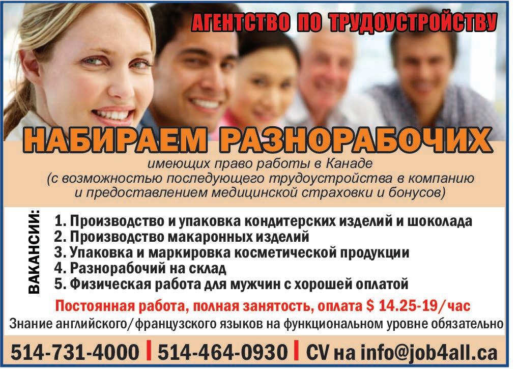 •БольшомумебельномумагазинувLaSalle требуетсяработница, владеющаяанглийскимифранцузскимязыками. Part time/full time. (514) 652-1965 , Kevin (англ., фр.)