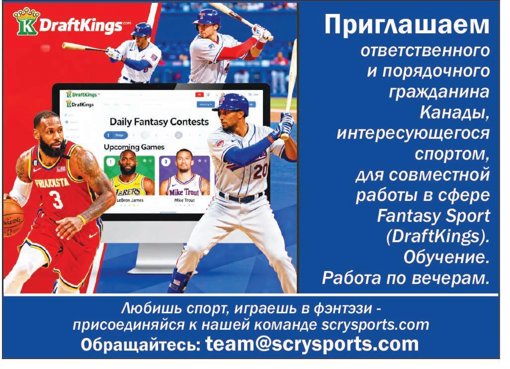 •Приглашаем ответственного и порядочного гражданина Канады, интересующегося спортом, для совместной работы в сфере Fantasy Sport (DraftKings). Обучение. Работа по вечерам. Обращайтесь: team@scrysports.com