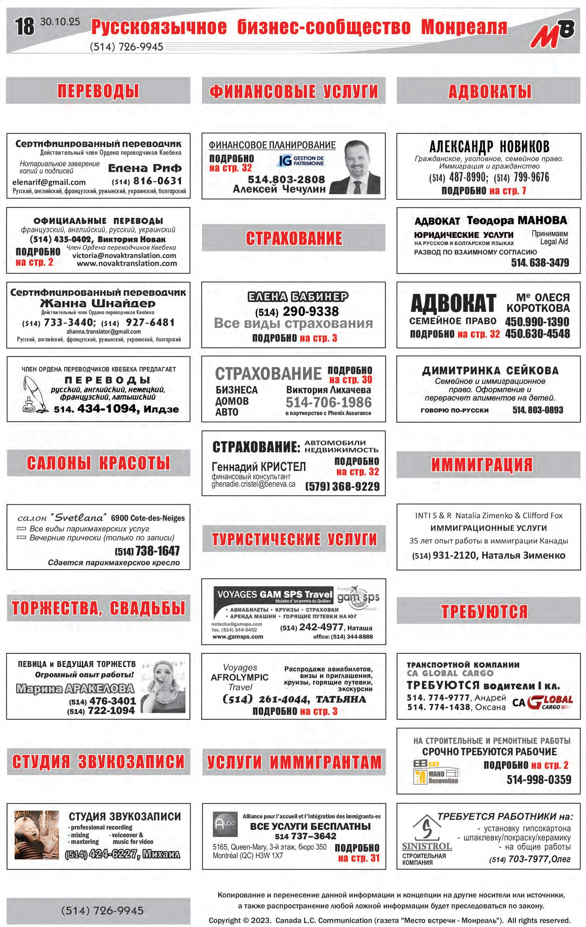 • Уроки рисования для детей и взрослых. В группе или индивидуально. Район Mont-Royal. Подробности по телефону (438) 686-2895 , Евгения •Математика для школьников. Индивидуально. Онлайн. Для любого уровня через приложение MICROSOFT TEAMS. (438) 526-2960 , Людмила • УРОКИ ФОРТЕПИАНО, СКРИПКИ, АЛЬТА ДЛЯ ДЕТЕЙ И ВЗРОСЛЫХ. Первое занятие бесплатно! Окончила Консерваторию, 10+ лет опыта. Научу играть любимую музыку! Атмосфера поддержки и творчества. (438) 389-2566 , Карина транСпортные УСлУги • ГРУЗОВЫЕ ПЕРЕВОЗКИ по Монреалю и Канаде. Storage. Профессионально. Требуются грузчики. (514) 839-8523 , Владимир