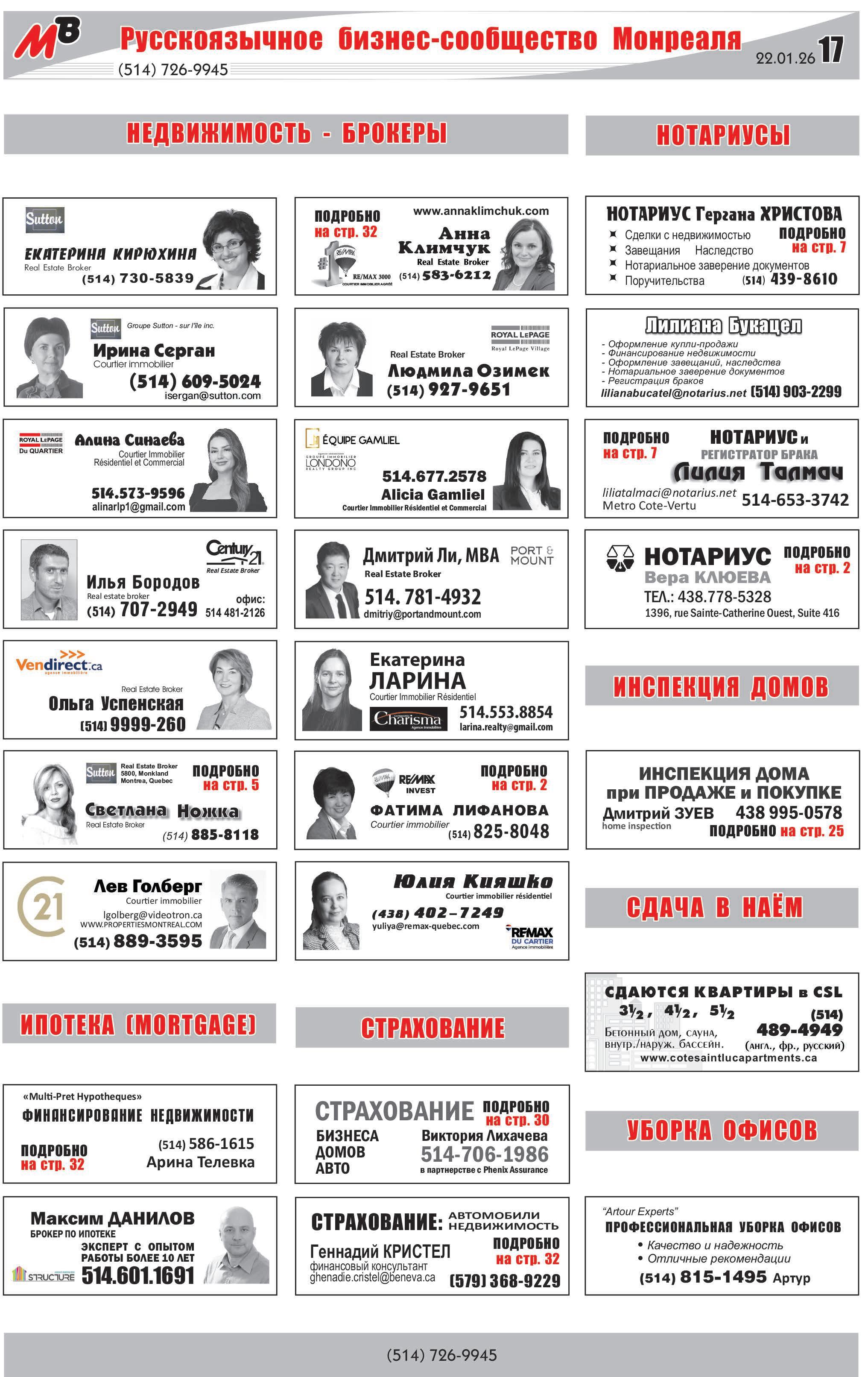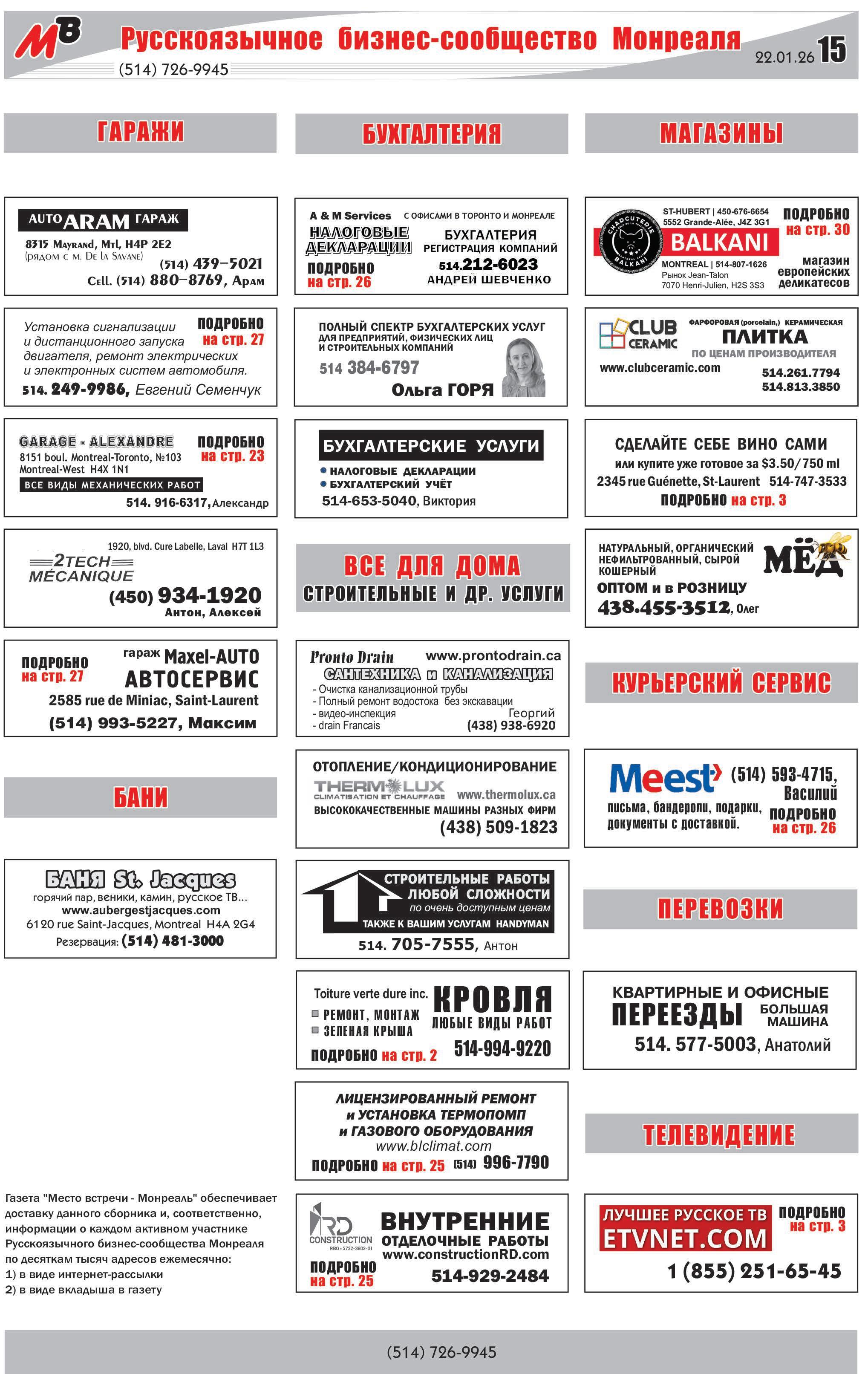 автомобиля. 6900 blvd. Decarie, suit 3130, метро Namur. (514) 343-0543; cell. (514) 824-2193 •Компания по уничтожению мышей, крыс, тараканов, клопов, муравьев и прочих вредителей. Также убираем грибковую плесень со стен. В квартирах, домах, коммерческих помещениях. Гарантия результата - до полного решения проблемы. Гибкие цены, пожилым людям - скидки. (514) 561-8933 , Анатолий
