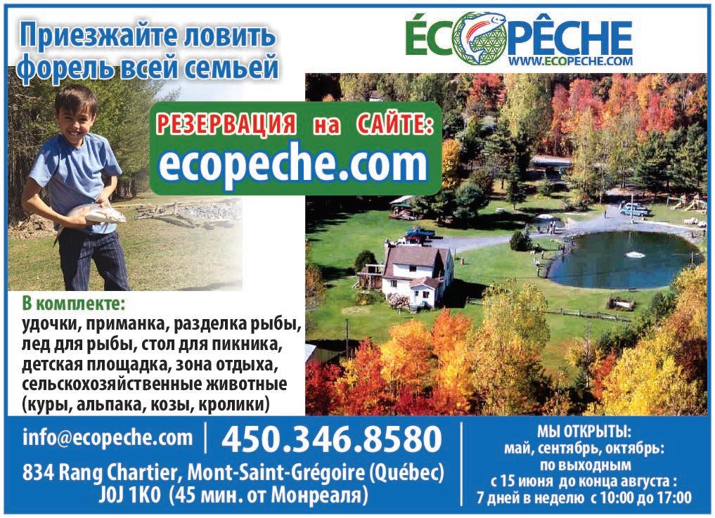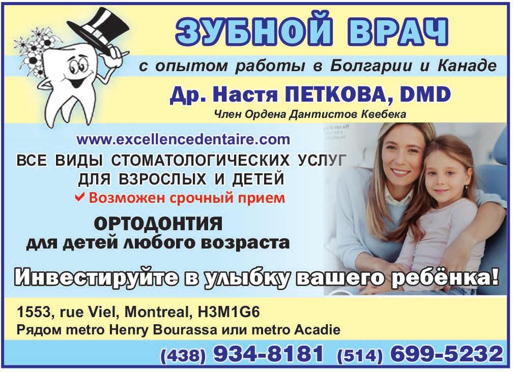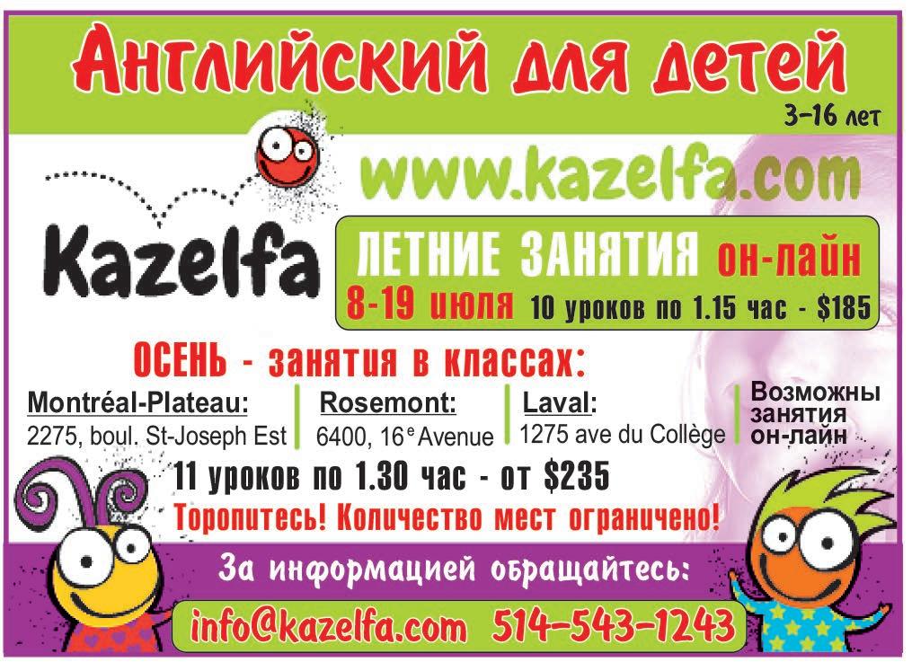интернет, а также возможность работать в выходные дни. (514) 726-9945 , Наталья детям • Рус ско-фран цуз ский дет ский сад в Laval «МАЛЕНЬКИЕ СЕРДЦА» при гла ша ет ма лы шей в мир лас ки, за бо ты и ув ле ка тель ных заня тий. Боль шой опыт ра бо ты. (514) 576-0800 , Татьяна • В связи с выпуском детей в школу в субсидируемом детском садике “КОТЯТА” появилось одно вакантное место. Райот NDG/CSL. (514) 777-4984 , Елена разное • Перевод денег в Россию и из России на банковский счет получателя в течении нескольких минут в присутствии отправителя. Расчет в канадских долларах по банковскому курсу (плюс комиссионные) после подтверждения перевода. (438) 342-8536