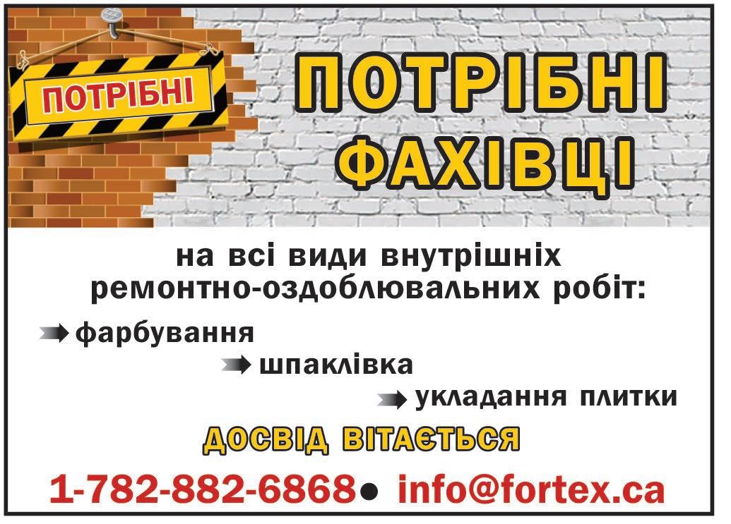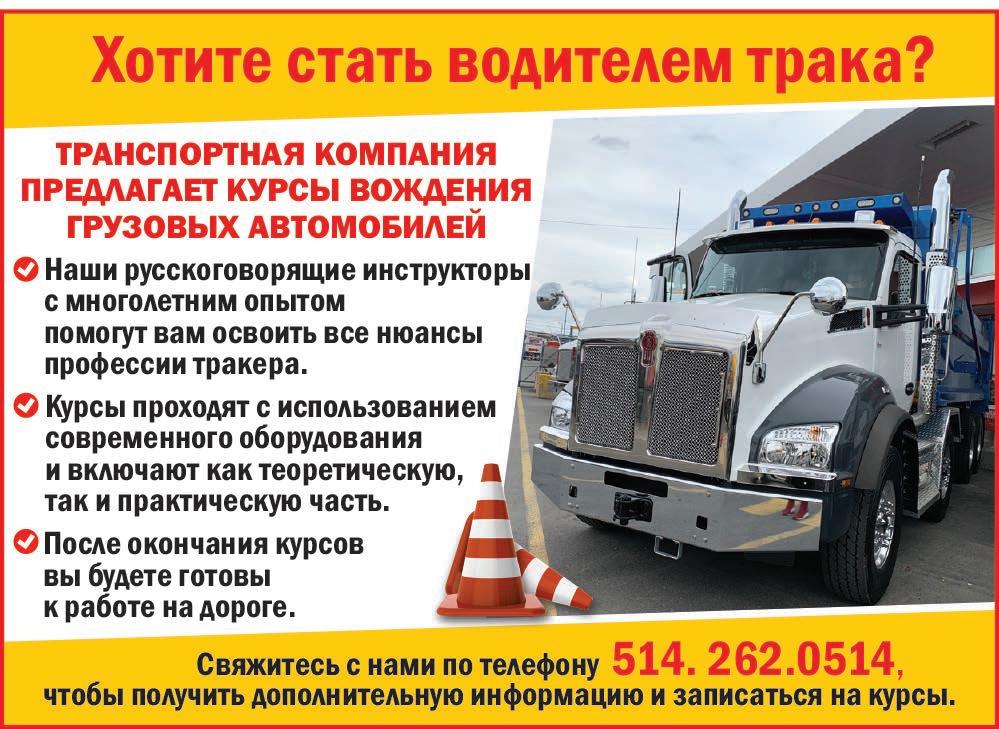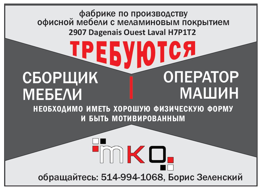 требуются работники с опытом на внутренние отделочные работы. (514) 929-2484, Роман • Строи тель ной ком па нии требу ют ся спе циа ли сты с опы том и без. На внут рен ние и на руж ные ра бо ты. (514) 443-8687 • Требуются работники на установку кондиционеров с опытом и без. Хорошая оплата и условия работы, дружный коллектив. (438) 526-2894 , Влад • Требуются швеи для работы на фабрике. Возможно обучение. Оплата по договоренности. Есть возможность работать на дому. (514) 885-5660, Юрий Владимирович • Требуются грузчики и водительгрузчик на доставку мебели и квартирные переезды.