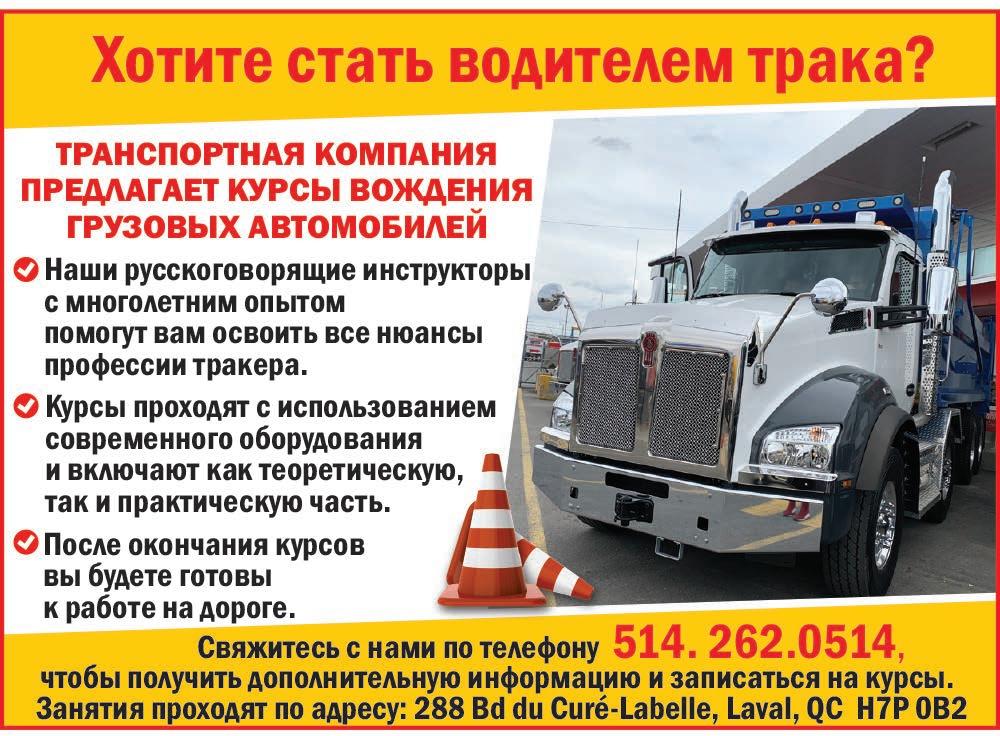 • Грузовые перевозки по Монреалю, Канаде на грузовом фургоне Форд Транзит-150. Недорого. Холодильники не перевожу. Добросовестность гарантирую. (514) 574-3749 •EVRASIA LOGISTIQUES Inc. МЕЖДУНАРОДНыЕ ГРУЗОВыЕ ПЕРЕВОЗКИ по воде и воздуху. Перевозки по Канаде. (514) 432-8901 ; sales@evrasia-freight.com • Перевозки на траке 5 класса (20ft) по всему Монреалю (раз в неделю - Торонто), в том числе доставка пианино. (514) 261-7688 , Александр; (438) 938-3526 , Сергей • AZTransport. ГРУ ЗО ВыЕ ПЕРЕ ВОЗ КИ (MOVING). Про фес сиональ но, бы ст ро, на деж но. www.montreal-moving.com; (514) 962-6577 к Вашим УСлУгам • Ре монт и об слу жи ва ние бы товой тех ни ки (А/С тер мо помп, хо лодиль ни ков, кон ди цио не ров, стираль ных, су шиль ных и по су до мо ечных ма шин, элек тро плит). Га рантия. (438) 989-4236 • ПЕРЕВОДы. Ус лу ги чле на Орде на пе ре во дчи ков Кве бе ка: англий ский-фран цуз ский-ив рит-ук раин ский-рус ский. ИММИГРАЦИОННыЕ УСЛУГИ. emily@ip-immigration.com; (514) 656-7472 , Эмилия • Член Ордена переводчиков Квебека. Переводы: русский, украинский, английский, французский, иврит. (514) 999-2548 ; (514) 488-7029 , Александра • Автомобильно-туристический сервис для всех, кто желает открыть красоты Квебека и Онтарио. Опция - шале в заповедном уголке. (514), 924-3292 , Михаил • Могу предсказать будущее, раскрыть секреты прошлого и сформировать настоящее с помощью интуитивногопредчувствия, гадание на цыганских картах patience/tarot/lenormand. oxxxagypsy@gmail.com; (514) 268-2991 , Оксана • Хо ти те са дить ся в те п лую маши ну зи мой и про хлад ную - ле том? Ус та нав ли ваю дис тан ци он ные запуск дви га те ля и от кры ва ние дверей на лю бые ма ши ны. Ре монт элек тро сис тем ав то мо би лей. (514) 249-9986 , Евгений • Автошкола "UNIQUE" - это гарантия успешного вождения легкового автомобиля. 6900 blvd. Decarie, suit 3130, метро Namur. (514) 343-0543; cell. (514) 824-2193 повсемвопросамобращайтесьпотелефону: 514. 369-4424