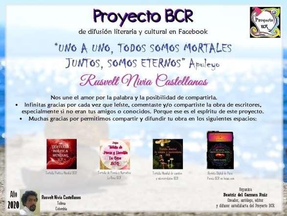 Rusvelt Nivia Castellanos; poeta y cuentista, novelista y ensayista, nacional de la Ciudad Musical de Colombia. Realizó estudios de primaria en el colegio, Rafael Pombo. De progresión, fue bachiller académico del colegio Comfenalco. Es en adelanto al mérito; Comunicador Social y Periodista, graduado por la Universidad del Tolima. Y es un especialista en Inglés, reconocido por la Universidad de Ibagué. En cuanto a sus obras, tiene ocho libros de relatos publicados. El primero se recita; Tu Otra Presencia, el segundo se llama; Alucinaciones por un Cielo y Otros Relatos, el tercero se bautiza; El Ángel del Milagro y Otros Relatos, el cuarto se exclama; Afuera de la Nada, el siguiente se decanta, Noches de Lluvia, el otro se renombra, Animaciones Efímeras, el próximo se revela, Poetas de Libertad, más el ulterior se glorifica, Las Invenciones de la Luz. Tiene creada la novela supercorta; Sólo de Conciencia. Además el artista, obró un libro de ensayos, llamado, Periodismo Literario en Colombia. Ya sobre sus obras de poesía, oleó los poemarios; La Embriaguez del Poeta, Musa de las Odas y Fabulación Holística. De mayor relación con el arte, compuso los álbumes de música; El grito del Alma, Amor a la Humanidad y Encantos Armónicos. Cuando después a lo espejista; obró toda la manifestación de pinturas, Creación de Vida. En cuanto a su gestión cultural, ha sido creador y participante del festival de narrativa y poesía, La literatura del Arte. Consecuente con su causa, ha participado en la Feria del Libro, Ciudad de Ibagué. También ha participado en la Feria Internacional del Libro, Bogotá, durante los eventos del