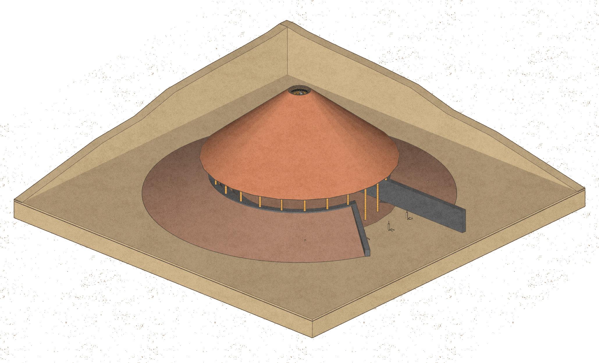 En esta etapa, se clavan cuatro estacas formando un cuadrado perfecto, el cual servirá como guía para el centro del círculo. Luego, con la ayuda de una cuerda de 5 mt a modo de compás, se traza el círculo y los ejes principales de la edificación. Finalmente, se marcan las zapatas que se ubican sobre estos ejes.