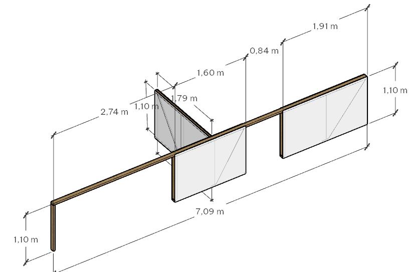 Se construye una estructura utilizando guadua de 1.16 mt de altura, que marca la posición del aro principal que recibirá las guaduas diagonales de la edificación. Para nivelar el aro, se crea un marco de madera cerrada de 4 x 8 cm, el cual se asegura con diagonales de guadua de 4 x 4 cm. Estas diagonales se fijan a la guadua principal para garantizar la estabilidad y precisión de la estructura temporal.
