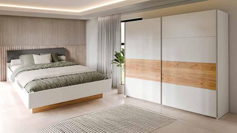 OMARA Z DRSNIMI VRATI, hrast/grafit, 2-vratna, passepartout za doplačilo, mere: 270x210x60 cm, 194793/1, POSTELJA, hrast/grafit, ležalna površina: 180x200 cm, vklj. 2 nočni omarici in oblazinjeno vzglavje, mere: 297x212 cm, 194793/2