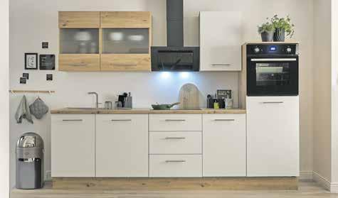 Cucina, colore: bianco opaco/rovere, 310x205 cm, inclusi gli elettrodomestici elencati, disponibile in diversi colori e configurazioni, lavastoviglie e lavello non inclusi nel prezzo, 197916