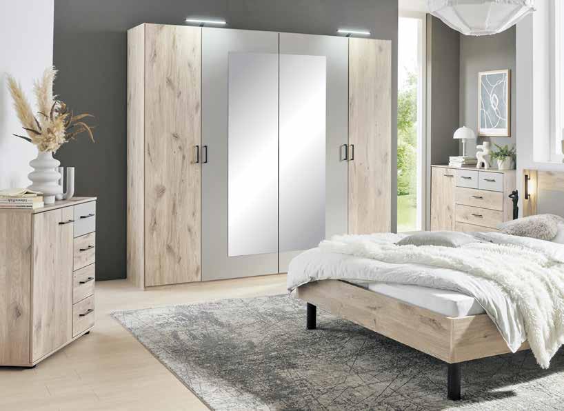 letto, colore: rovere/grigio, composta da: armadio con ante scorrevoli, LxAxP: 225x208x58 cm, letto 180x200 cm con illuminazione LED (classe energetica F), complementi d'arredo ed illuminazione armadio a sovrapprezzo, 203590
