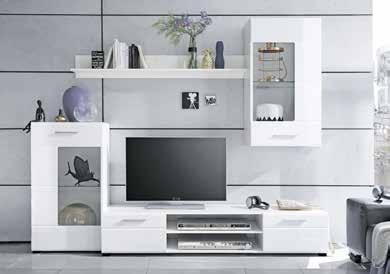 Parete soggiorno, colore: bianco lucido, misure: 230x190x40 cm, composta da: mobile TV, misure: 175x34x40 cm, vetrina, misure: 55x103x33 cm, vetrina sospesa, misure: 55x101x33 cm, mensola da parete, misure: 138x20x21 cm, 193042