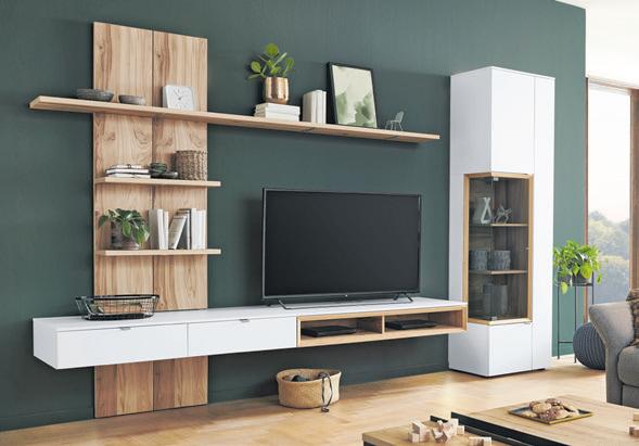 Wohnwand, Lack kristallweiß matt/Eiche rustico hell, geölt, BxHxT: 320x53x207 cm. Beleuchtung, Kabeldurchlass und Eckverglasung gegen Mehrpreis, 193903/5 4.039-*