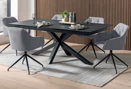 Stuhl, Stoff, grau, Metallgestell: schwarz matt, mit Armlehnen, um 360° drehbar, in verschiedenen Farben erhältlich, 201449/0-3. Tisch, Glas/Keramik, schwarz, Metallgestell: schwarz matt, Maße: 160x90 cm, 195084