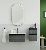 Badezimmer, Eiche grau, Griffe: schwarz, bestehend aus: Waschtischunterschrank, Keramikwaschtisch/weiß und Flächenspiegel inkl. Beleuchtung und Heizung. Beimöbel gegen Mehrpreis, 203901