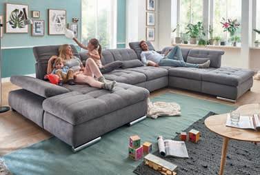 Sedežna garnitura, tkanina, siva, vklj. nastavljiva globina sedenja, mere: 185x294 cm, na voljo v različnih postavitvah in barvnih kombinacijah. Nastavljivi nasloni za glavo in za roke, blazine in tabure za doplačilo, 203907/1