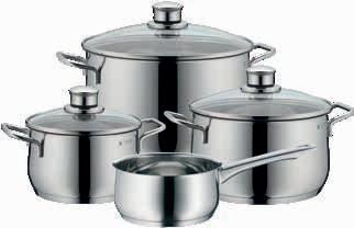 Komplet loncev, 4-delni, sestavljen iz 3x lonec (16/20/24 cm) s pokrovom, 1x kozica (16 cm), Cromargan®: nerjaveče jeklo 18/10, primerno za vse kuhalne površine, tudi indukcijo, primerno za pomivalni stroj in pečico (do 180 °C), 667022