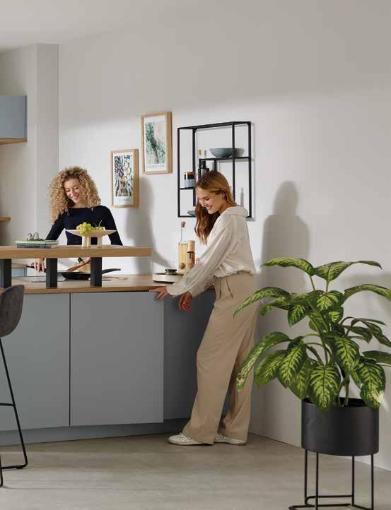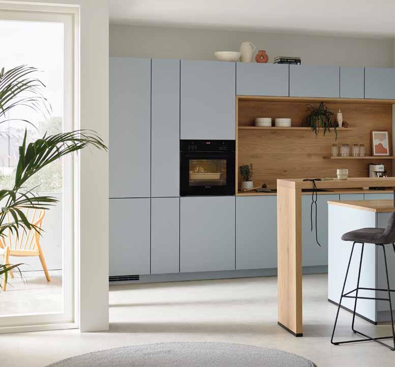 CUCINA, colore: Sky laccato opaco, ca. 363 cm+180 cm+90 cm (tavolo), disponibile in diverse configurazioni e combinazioni di colori. Elettrodomestici da incasso e lavello disponibili con supplemento, 204865