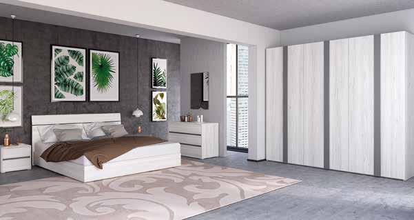 CAMERA DA LETTO, colore: bianco frassino/grigio ghiaccio, composta da: armadio a 6 ante battenti, misure: 240x238x55 cm, letto matrimoniale 160x200 cm con contenitore, 2 comodini, comò con 3 cassetti, specchiera, 199135