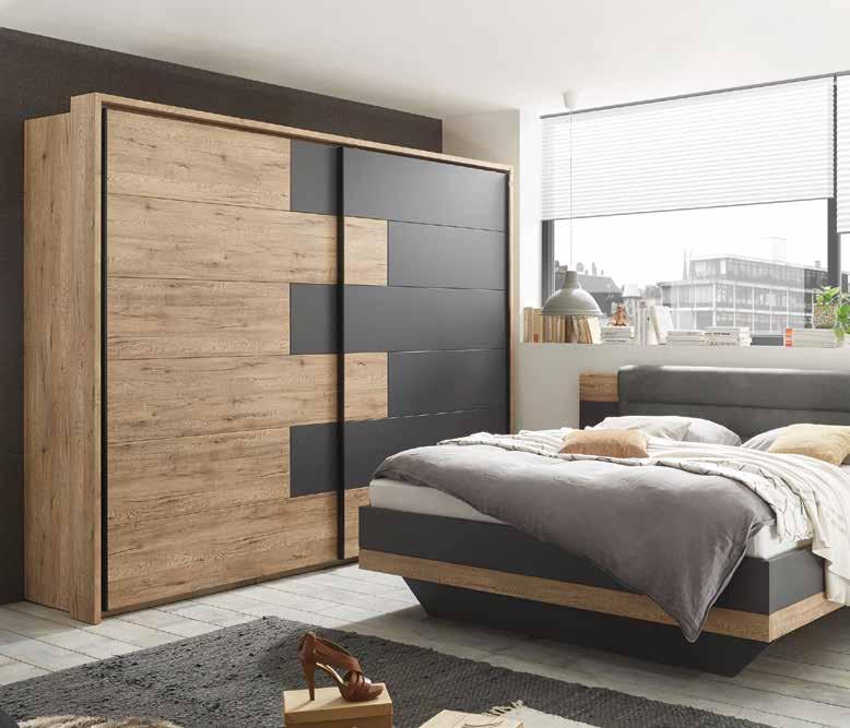 ARMADIO CON ANTE SCORREVOLI, colore: rovere/grigio grafite, numero ante: 2, con tubo appendiabiti, misure: 270x210x60 cm, passepartout non incluso nel prezzo, misure: 270x210x60 cm, 194793/1, LETTO MATRIMONIALE 180X200 CM, colore: rovere/grigio grafite, incl. 2 comodini e testiera imbottita, misure: 297x46-99x212 cm, 194793/2