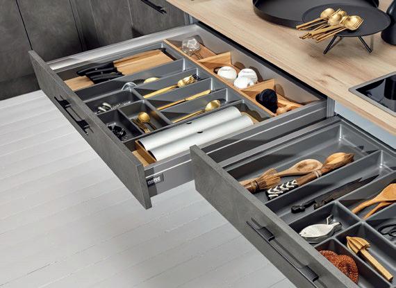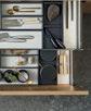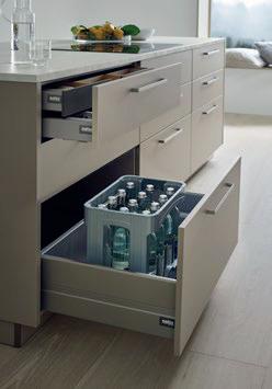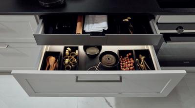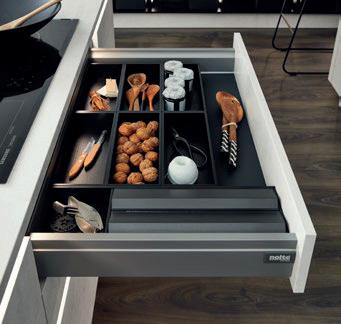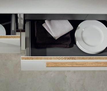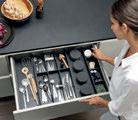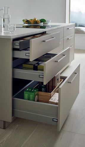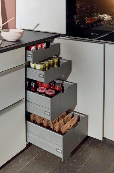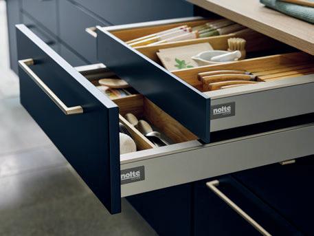 Matrix 800 bietet Ihnen jede Menge Gestaltungsspielraum. Ob klassisch mit einem 15 cm hohen Schubkasten und den neuen 25 cm und 40 cm hohen Auszügen oder designorientiert und symmetrisch mit Varianten wie 40/40 cm, 20/20/40 cm oder 20/20/20/20 cm – hier ist für jeden Stil etwas dabei. Und das Beste: Sie können nach Bedarf auch in den hohen Auszügen Innenschubkästen einplanen, perfekt z. B. für Kochtopfdeckel oder andere Küchenutensilien, die immer griffbereit sein sollen.