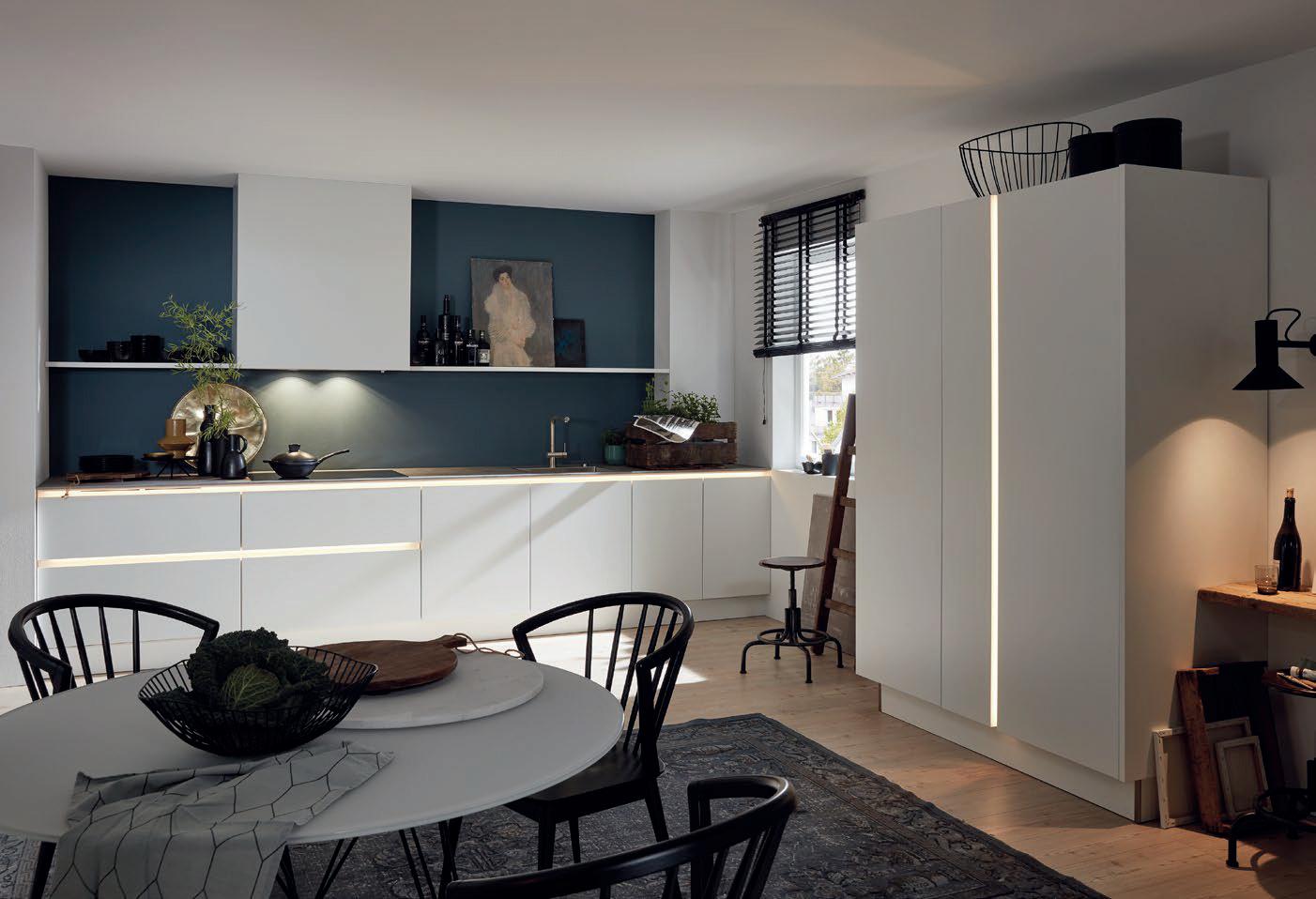 MatrixArt ist die designorientierte, grifflose Nolte Küche: Mit maximal zwei horizontalen Griffspuren entsteht somit eine besonders aufgeräumte und grafische Optik. Bei Seitenschränken haben Sie die Möglichkeit auch senkrechte Griffspuren einzuplanen. Alle Griffspuren können auf Wunsch beleuchtet werden und setzen somit die Linienführung gekonnt in Szene. Sie können hier aus sieben verschiedenen Farben wählen: ob kontrastreich oder Ton in Ton, mit feinen Akzenten oder markanten Highlights.