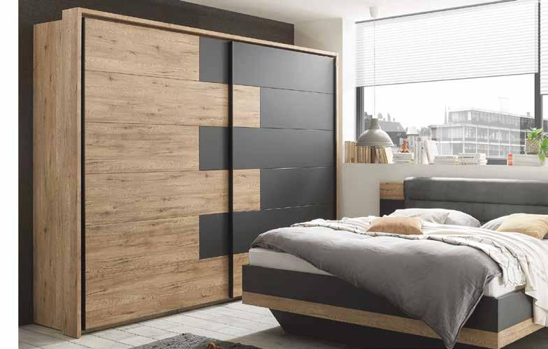 ARMADIO CON ANTE SCORREVOLI, colore: grigio grafite/rovere, numero ante: 2, con appendiabiti, misure: 270x210x60 cm, il passepartout non è incluso nel prezzo, 194793/1. LETTO MATRIMONIALE 180X200 CM, colore: grigio grafite/rovere, incl. 2 comodini e testiera imbottita, superficie letto: 180x200 cm, misure: 297x46-99x212 cm, 194793/2