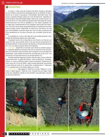 5 PALESTRAS La mayor y mejor zona de iniciación del Valle. Creada en principio por los militares y actualmente reequipada casi en su totalidad. En pleno verano es un sector muy popular y frecuentado, ideal para hacer vida social. La pared principal cuenta con unos 30 itinerarios, repartidos en diversos pisos cuyas dificultades llegan hasta el 6b, aunque la gran mayoría son de IV y V. Aquí podremos escalar hasta tres largos de cuerda. Hasta hace poco las vías se acababan en una repisa, equipada con un cable, pero recientemente se han ampliado hacia arriba tres itinerarios. Con esta nueva opción se puede practicar el montaje de reuniones (hasta 6 largos cortos), obteniendo un máximo de 130 metros. Es más que recomendable no escalar estas tres vías si existe la presencia de otros escaladores en los pisos inferiores, por la posible caída de piedras. La escalada es un poco más tiesa de lo que pudiera parecer, pero dotada de excelentes agarres por todos lados. El pequeño sector de la izquierda es otra historia, se trata de una placa muy lisa, que contiene otras 5 vías que servían para practicar la escalada artificial. En libre ofrecen interesantes y tensas alternativas de 6c+ y 7a, con algún proyecto difícil por encadenar. • Acceso: dejaremos el vehículo justo dónde la carretera pasa el río. Después debemos remontarlo bien por la izquierda (más cómodo), bien por la derecha (más incómodo, pero necesario si es a principios de temporada). Justo dónde encontramos una pista que cruza el río, nos desviamos a la izquierda hacia la ya cercana pared (15’). También podemos llegar por la pista, ésta se coge un poco antes del aparcamiento del río (pista del Solano), hacia la derecha e, inmediatamente, un nuevo y definitivo desvío hacia la izquierda. Pasaremos primero cerca de la Torre de Marfil, luego la pista desciende suavemente y, justo antes de cruzar el río, aparcamos. La pared está a 1’. Apta para 4 x 4 y aquellos que no le tengan apego a su coche. • Descenso: descuelgue si hacemos un largo. Repisas a la derecha o cable superior. Todas las vías, incluidas las que llegan hasta arriba son rapelables. Desde la cima también se puede bajar a pie por la canal de la derecha.