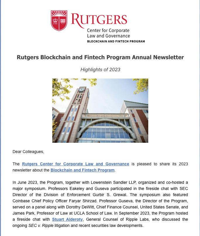 PROFESSOR YULIYA GUSEVA RECEIVED THE 2023 UNIVERSITY BLOCKCHAIN RESEARCH INITIATIVE (UBRI) Educator Award for the faculty member “who created the most outstanding program that makes the biggest impact.” She received the award at UBRI Connect, the annual conference bringing together UBRI’s 50+ university members from around the world. Nominations were submitted by participating universities on four continents.