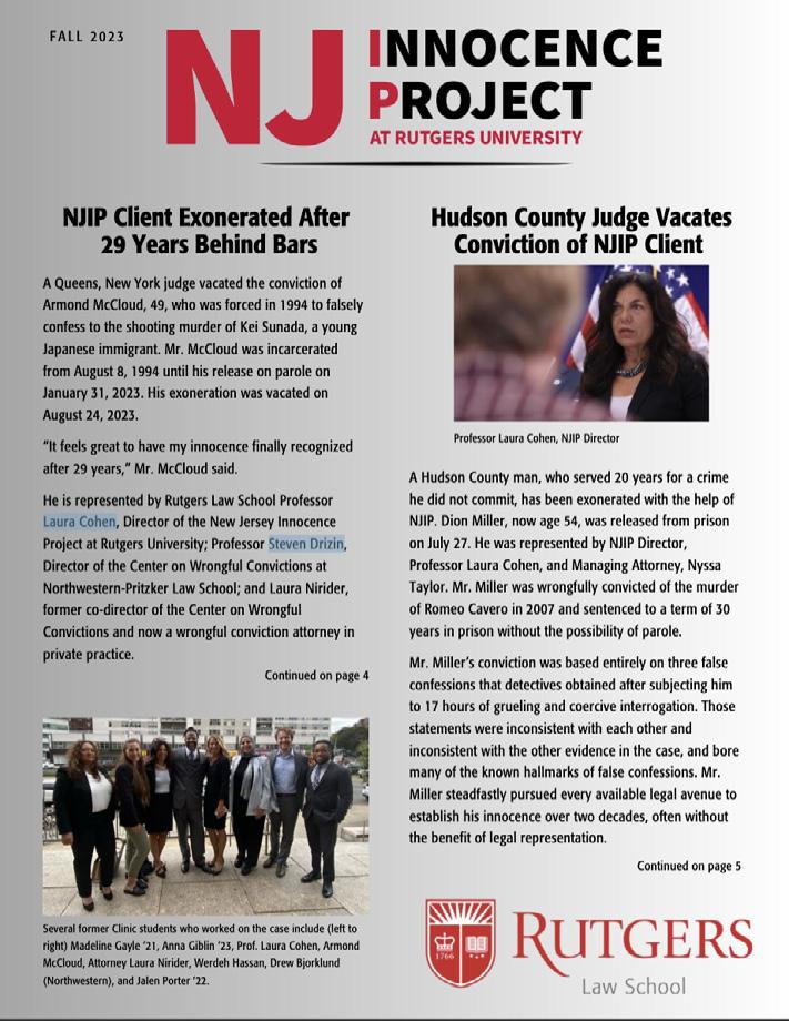 (NJIP) at Rutgers University advocates for the exoneration, release, and restoration to society of innocent people incarcerated in New Jersey. Officially launched in 2022 under the aegis of the Rutgers Criminal and Youth Justice Clinic, the NJIP represents factually innocent people in New Jersey in their efforts to vacate their wrongful convictions and obtain their freedom from incarceration. It is the first New Jersey affiliate of the National Innocence Network. Since opening its doors in 2022, the Project’s small but dedicated team accomplished much, including: