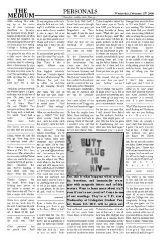Dear girl who sits in the front in 205 with Detlef... I saw you reading The Medium and think that you should come to a meeting to find out who is writing this personal to you. I know it is killing you. Come on. I swear that I am a cute boy and not a trap-lesbian. Sincerely Anonymous CS guy your gay.. if you wake up in the middle of the night because there is a shirtless dude poking you in the butt with his boner.. thats god’s way of telling you that your gay I don’t hate anyone right now and I love it. (Give in to your anger. With each passing moment you make yourself more my servant. It is unavoidable. It is your destiny.) Why? Why do you so suck so much fucking ass? You know who you are you fucking a s s - H o o v e r . GRR! I hate...uh...actually I don’t really hate that much, I guess. I’m sorry. I’m very bad at this... I really like the medium you guys are funny. PS COCK Ok, for all you tab readers out there, I have a very easy song for you. I know this will be hard to read since it’s in a paper, but bear with me. It’s all on the high e-string. 0020540020750095442 10 10 9 7 5. E n j o y ! (And