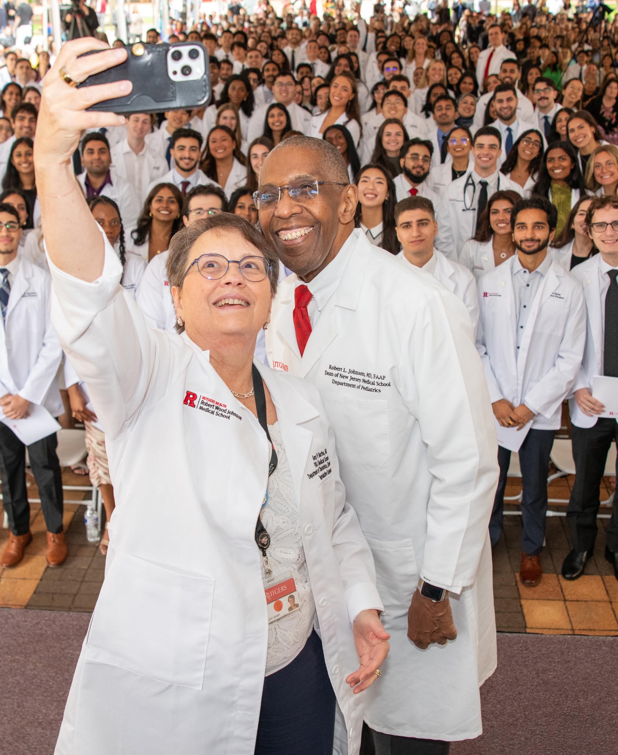 Deans Robert Johnson, MD, and Amy Murtha, MD, celebrate White Coat Day with students. Watch the video
