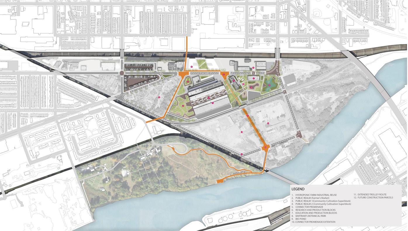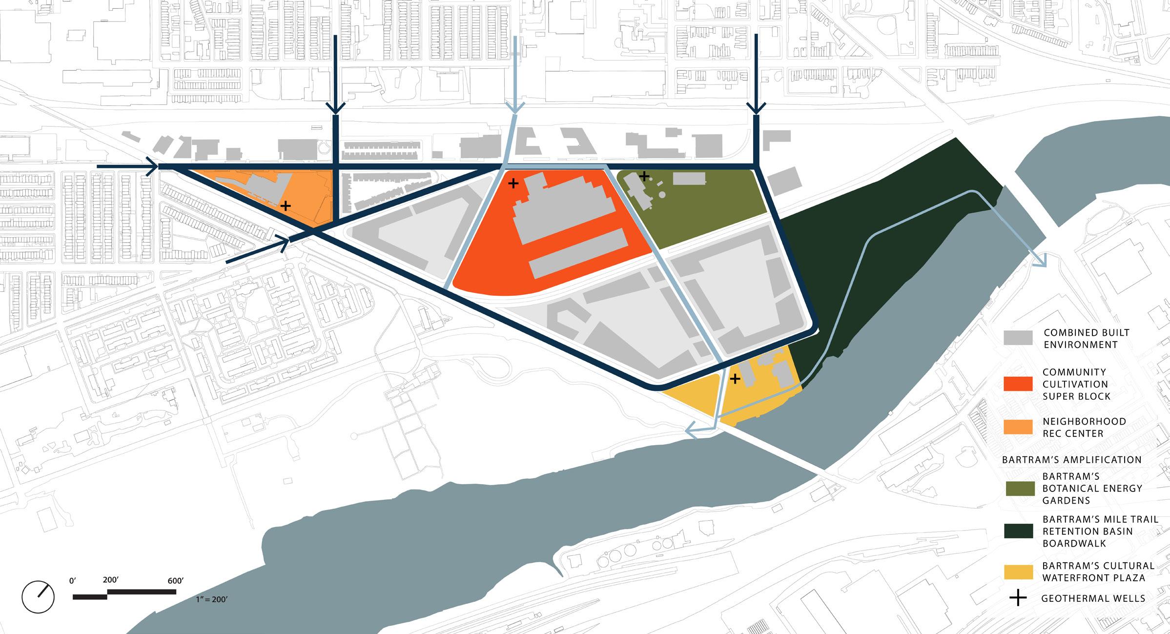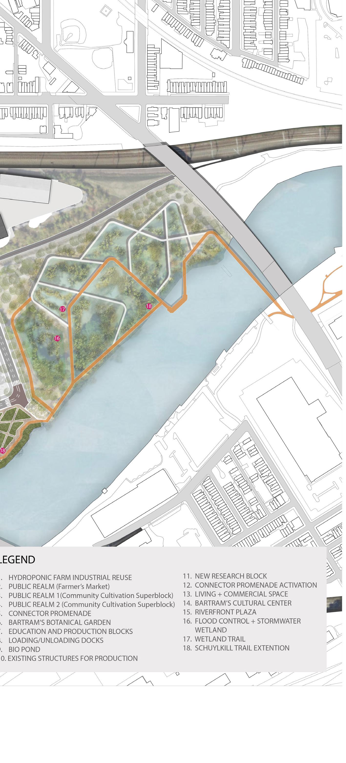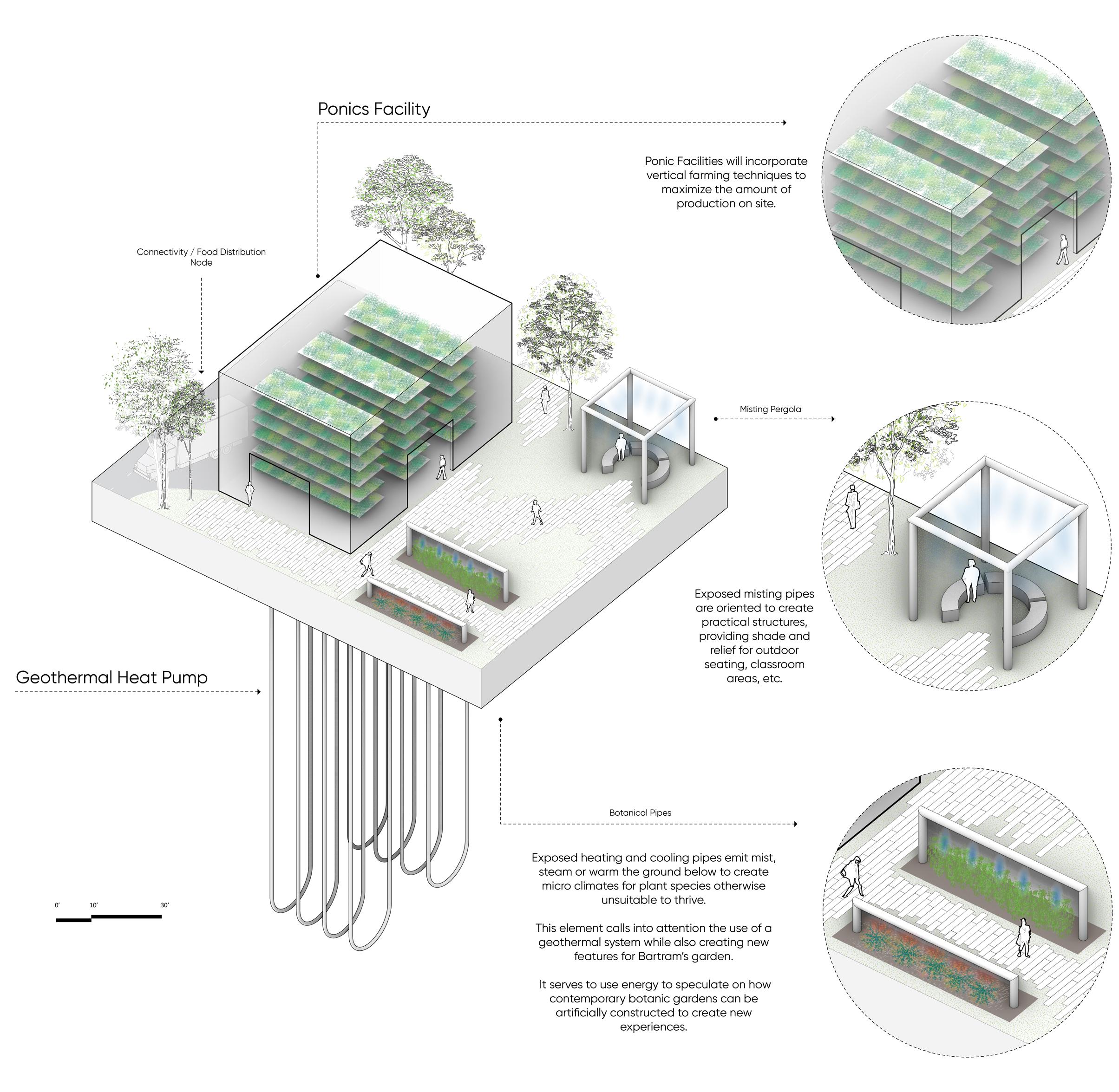 This site, positioned on the edge of the Schuylkill River adjacent to the historic Bartram’s Garden, is designed for both a low and high investment strategy. The project’s framework is driven by two sources of inspiration: Bartram’s Garden and the site’s abandoned industrial buildings. The design aims to amplify Bartram’s by bringing in community and vertical farming techniques, additional geothermal wells for power, and new botanic garden spaces. By investing in the existing buildings, the design reconfigures a new industrial core, exhibits new public garden spaces, and houses education for that enhances Bartram’s mission.