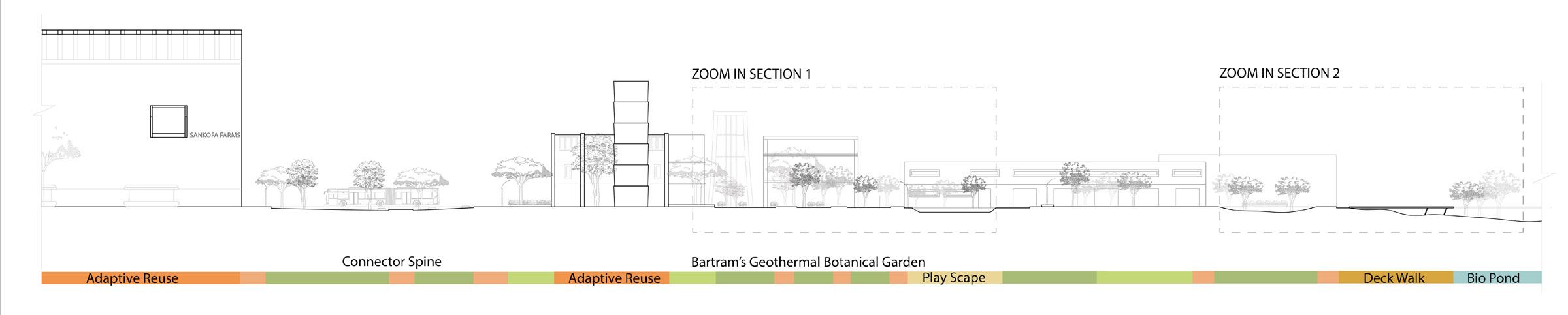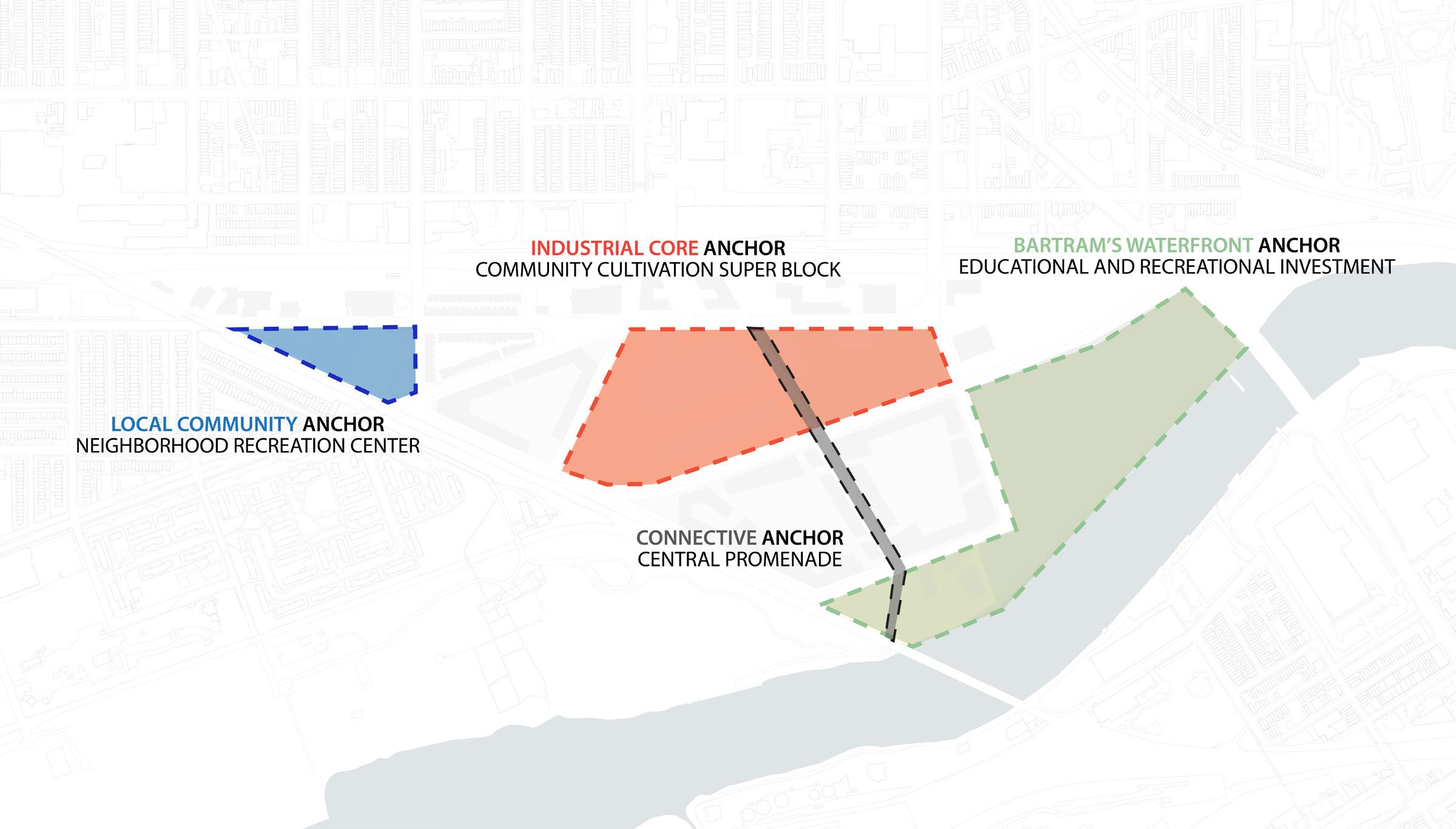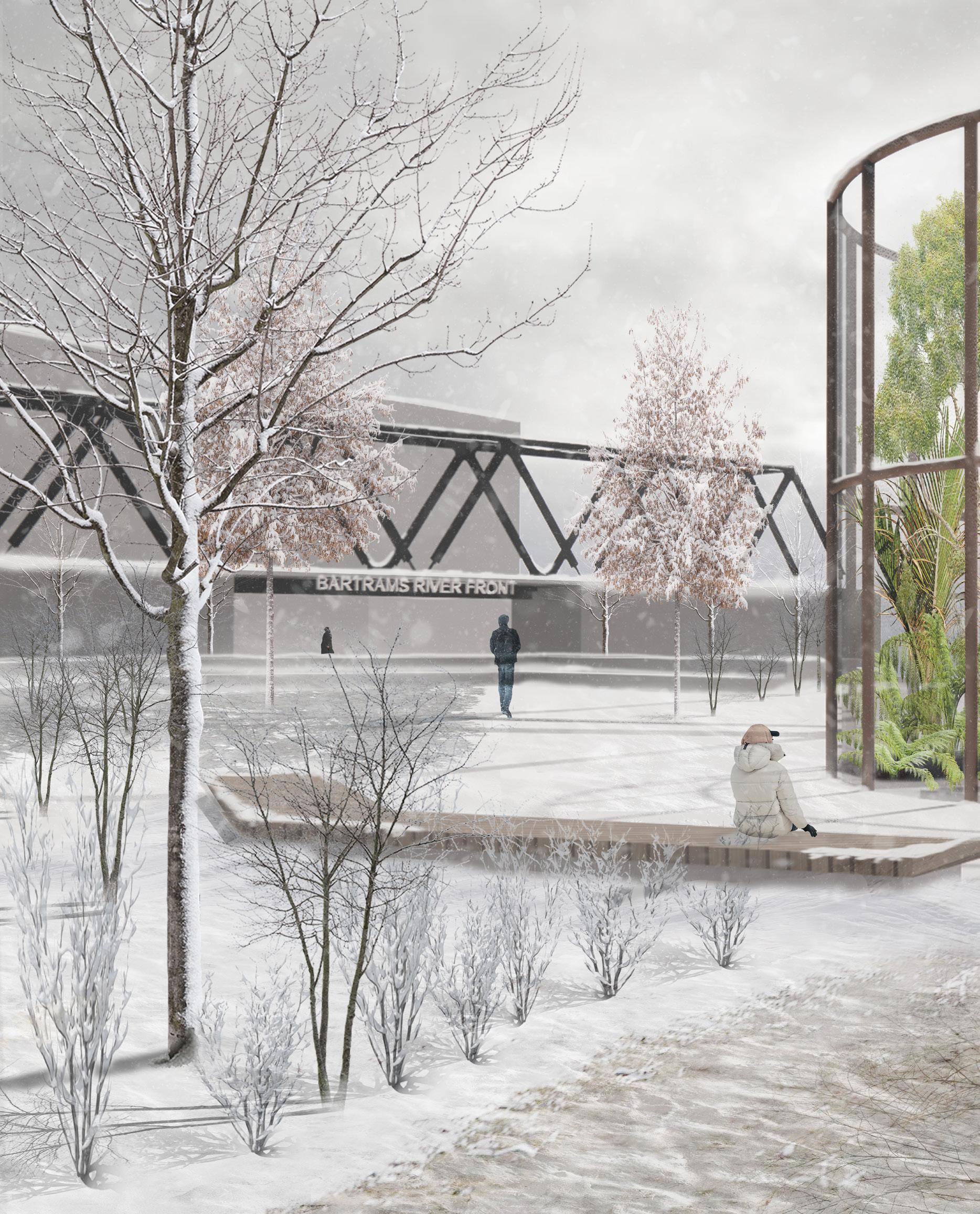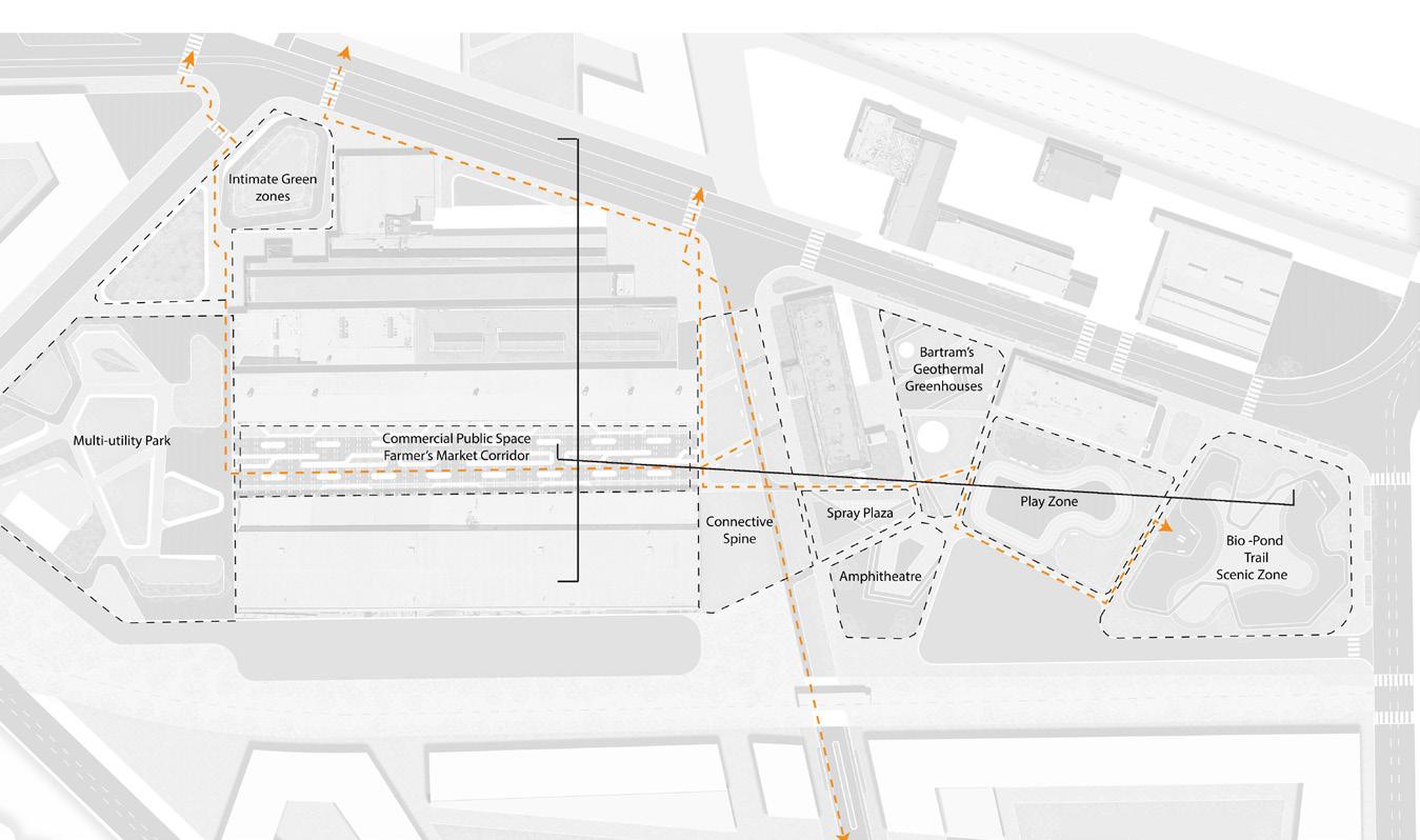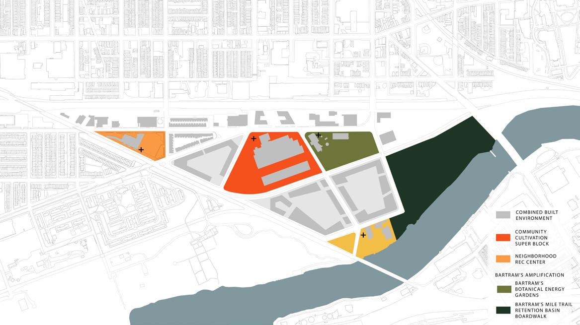 This site, positioned on the edge of the Schuylkill River adjacent to the historic Bartram’s Garden, is designed for both a low and high investment strategy. The project’s framework is driven by two sources of inspiration: Bartram’s Garden and the site’s abandoned industrial buildings. The design aims to amplify Bartram’s by bringing in community and vertical farming techniques, additional geothermal wells for power, and new botanic garden spaces. By investing in the existing buildings, the design reconfigures a new industrial core, exhibits new public garden spaces, and houses education for that enhances Bartram’s mission.