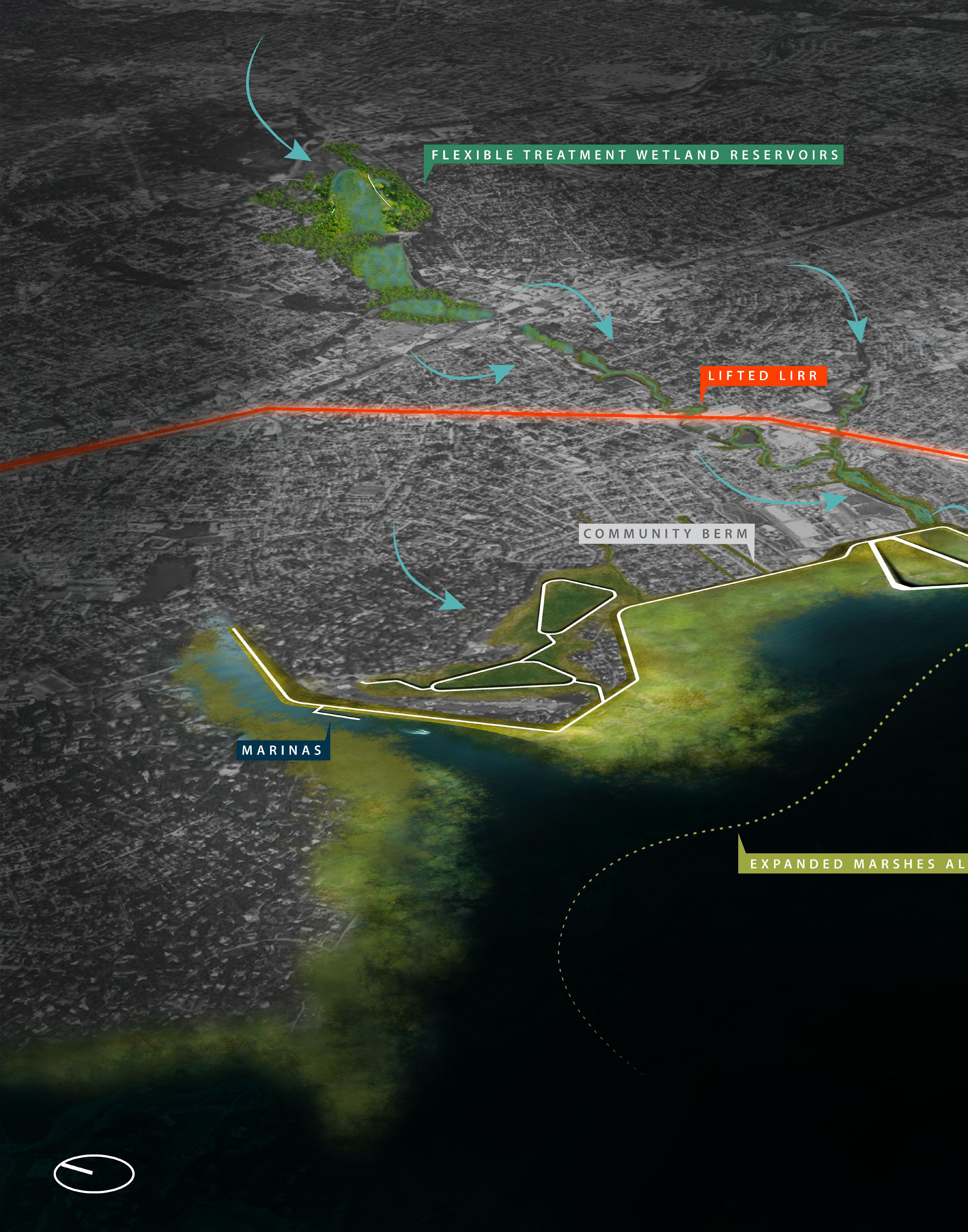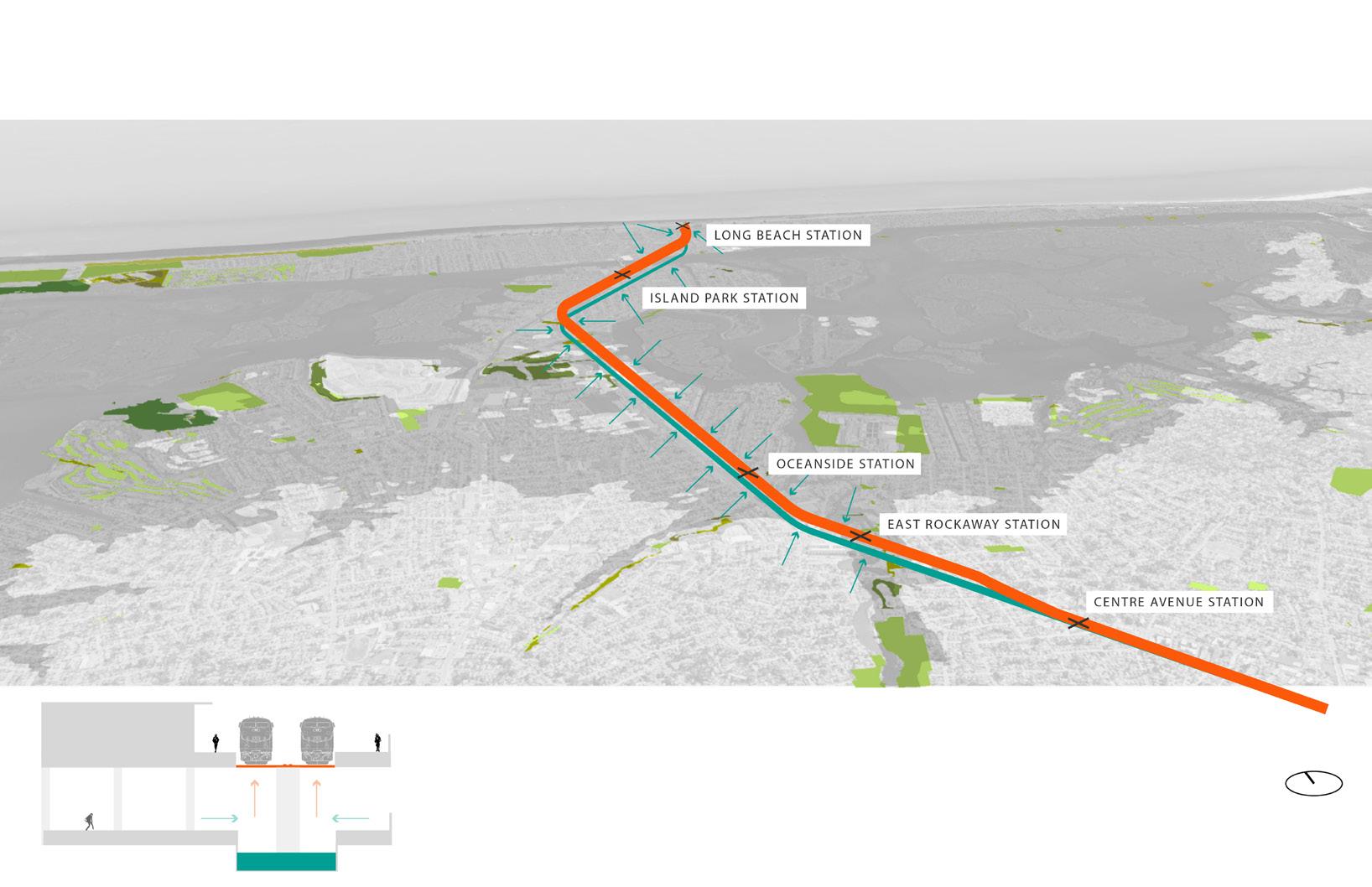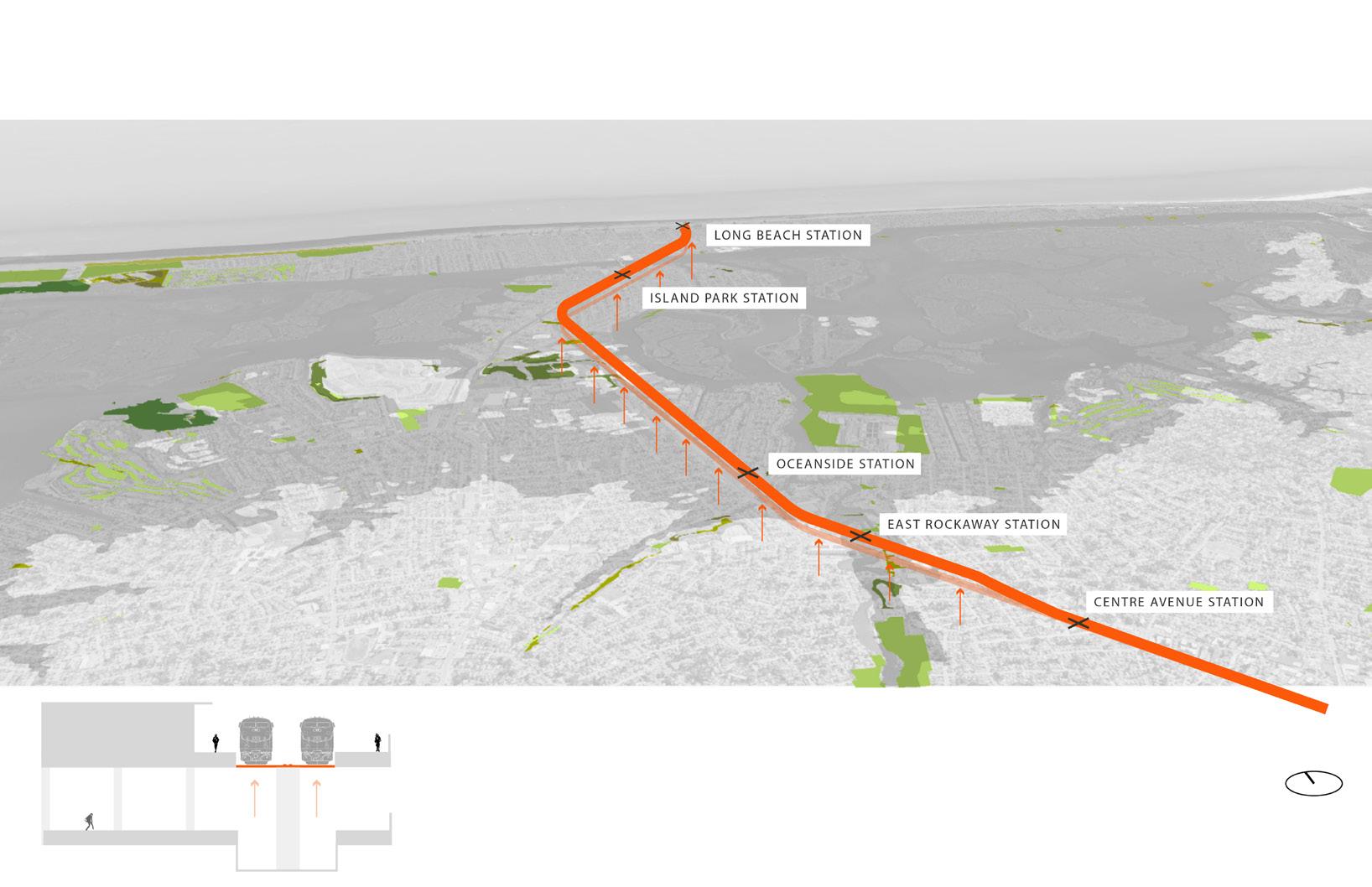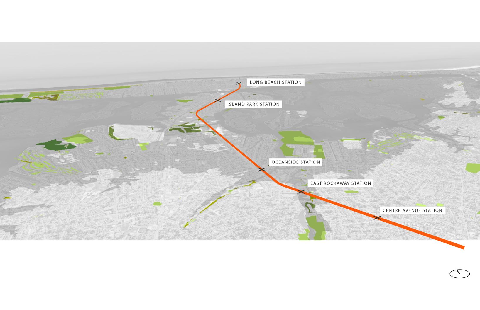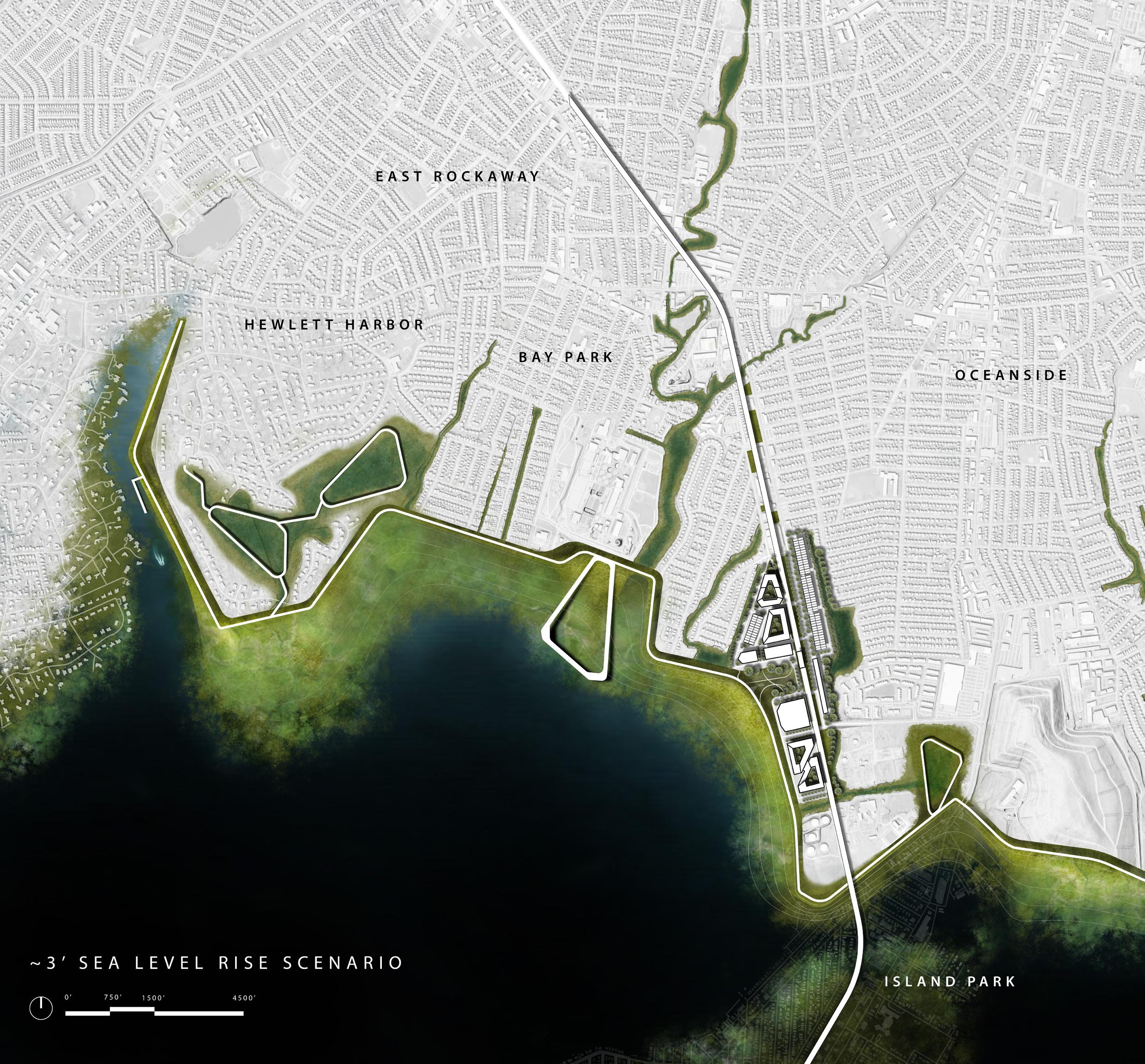 The proposal is focused in southern Nassau County in the neighborhoods of Hewlett Bay, Oceanside, and Island Park. While this project does not account for any specific design strategies in Long Beach (with the exception of the LIRR line being physically elevated), it follows the assumption that due to its high density, other protection and design measures will be taken for its protection.