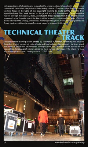 Technical theater training is now offered by The Marcia P. Hoffman Performing Arts Institute through a limited number of high schools and local colleges. Workshops in lighting, sound, and technical design will be scheduled throughout the year. Students will be able to observe work calls and shadow professionals, preparing them for paid internships in the future. For more information please contact the registrars at 727.712.2706